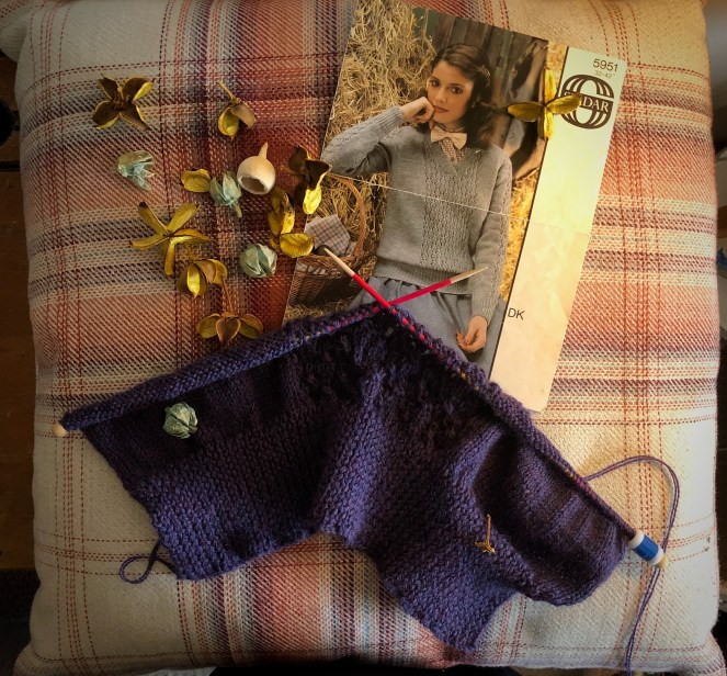 The lace pattern is an 8-row repeat which I’m sure I will soon have committed to memory, and will probably be able to ‘read’ in another few rows. I had quite forgotten that this pattern has the lace panel on the back as well as the front and I’m not entirely sure how I feel about that, but I am working it anyway. I think I will need to wear something underneath it that really makes the lace pattern pop; I’m just beginning to wonder if a blouse in some shade of yellow might be just the thing. Oh, it would need to be a warm, autumnul, golden-yellow – something along the lines of these dried flowers, for example. I can get behind that vibe for as long as it takes for me to find that no-one is selling such an item this year.