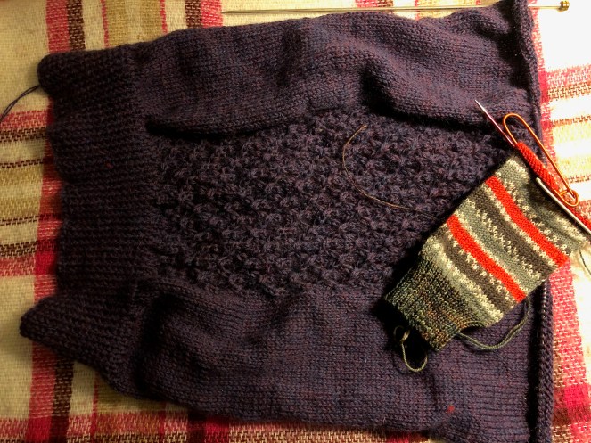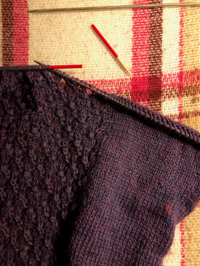 Ouch! I just picked up the knitting to take the photo and the needle snapped. Guess I shan’t bother to review these ones, just chalk them up to lessons learnt. I’ll carry on using the 3.5mm aluminium needles I’ve put the work on, but I’m not sure they will suit me and if they make a visible difference to the stitches I’ll have to think again. On the plus side, I am just about to start the armhole shaping, so I’m making good progress. Or I was, until I started those socks.