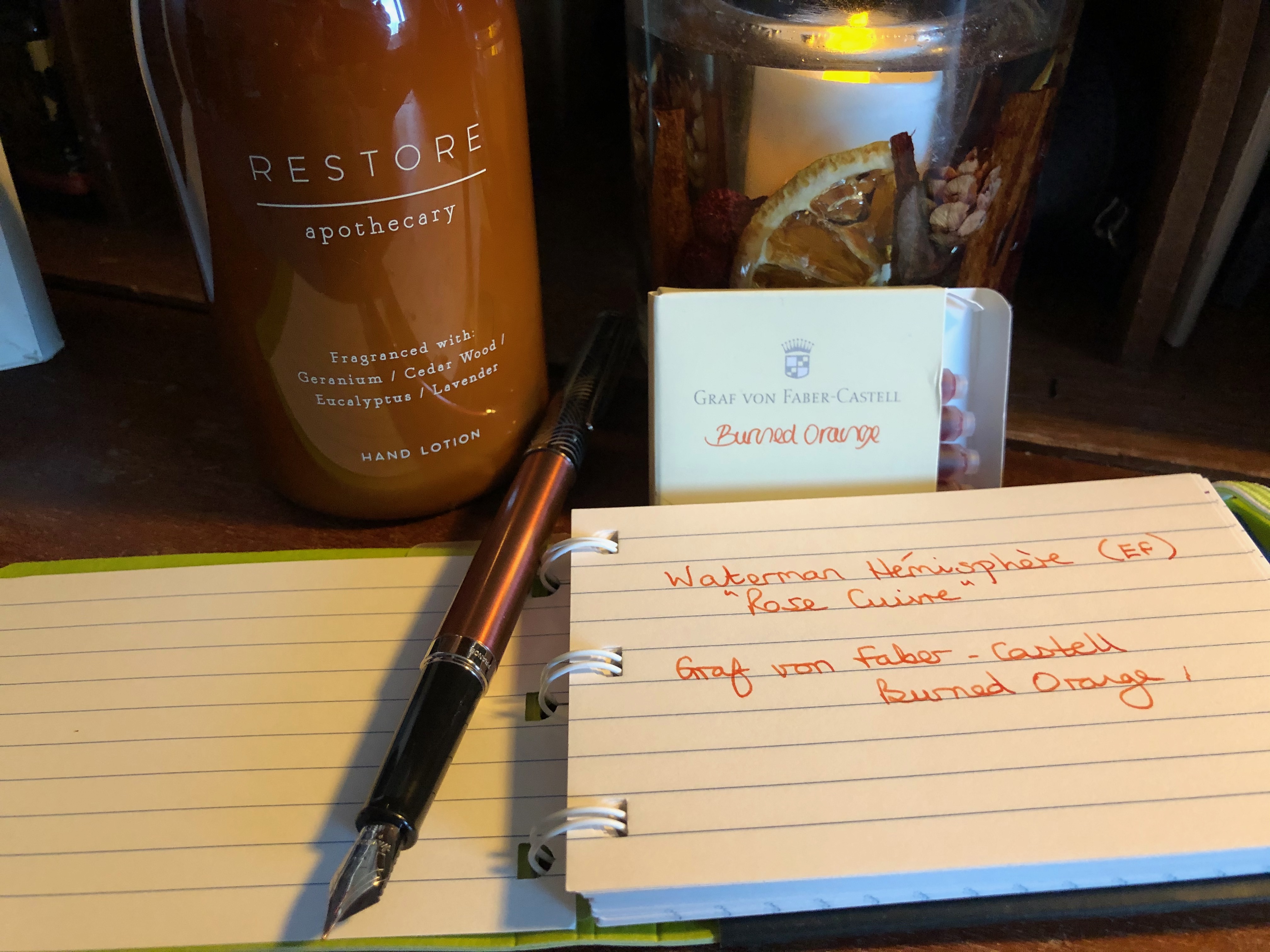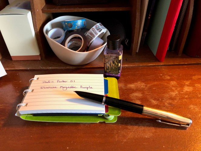 I shall mainly use the Lamy Studio and if I should happen to use up all the ink in that, move on to the Parker 51. The Waterman with the Burned Orange ink sits somewhat to the side as it is my go-to for anything that needs to stand out from the general text. I’m really feeling the vibes of the purple and orange, though, so don’t be surprised if next time you check in you find that I’ve used up the purple ink and not touched the Studio with its blue ink at all.