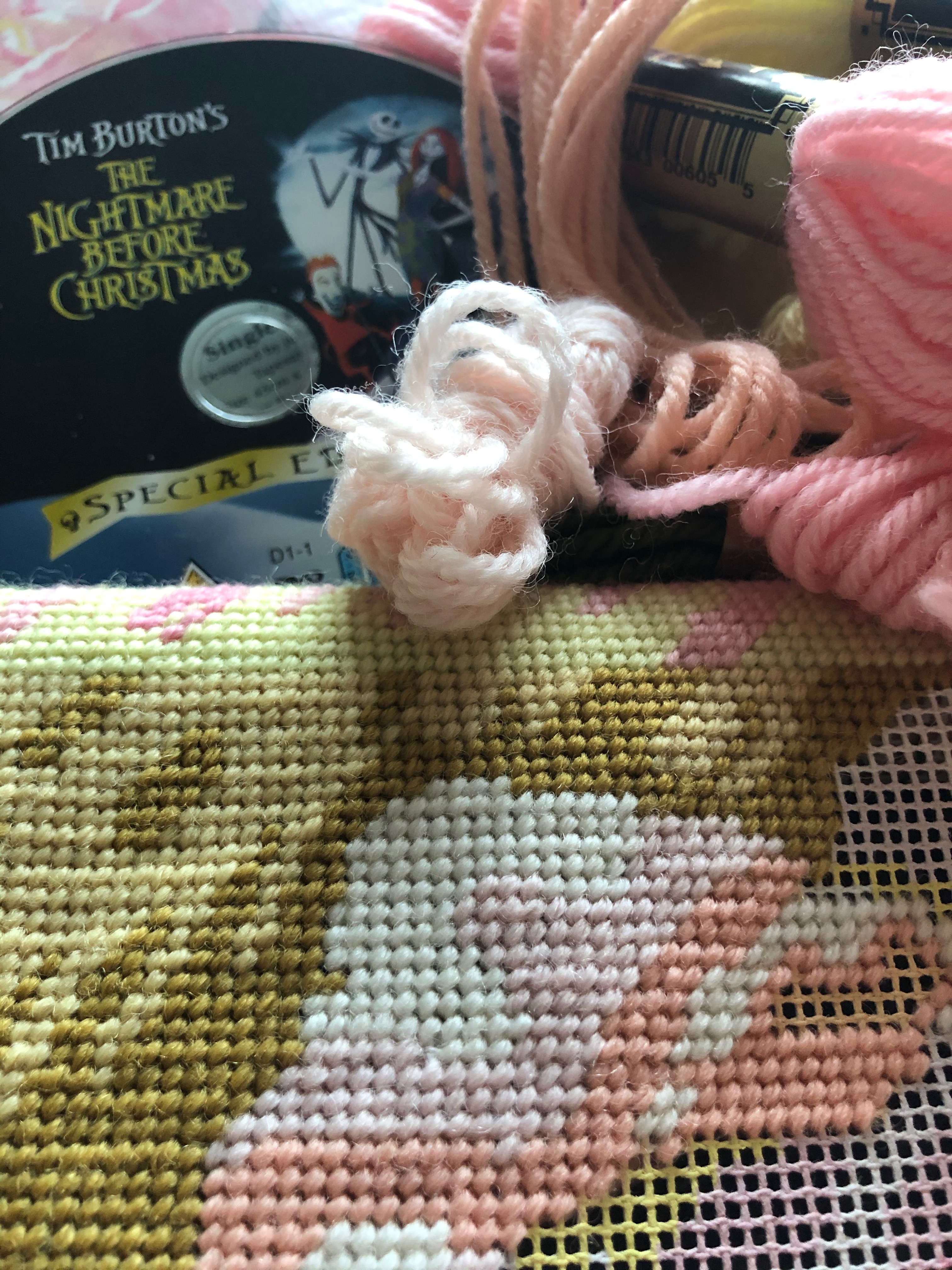 Given that aeons passed so far and the cushion cover is still attached to this frame, I think I can safely presume that the overall wellbeing of the universe is not relying on a perfectly-executed piece of needlework. Indeed, it may be that the whole point of picking this up right now is to show myself that I can afford to be less uptight about things, adopt an attitude of laissez-faire, accept that the colour wool needed for a particular area is one of the paler colours and it won’t matter much which one I use. Perhaps, just for this one project, “good enough” is actually going to have to be good enough.