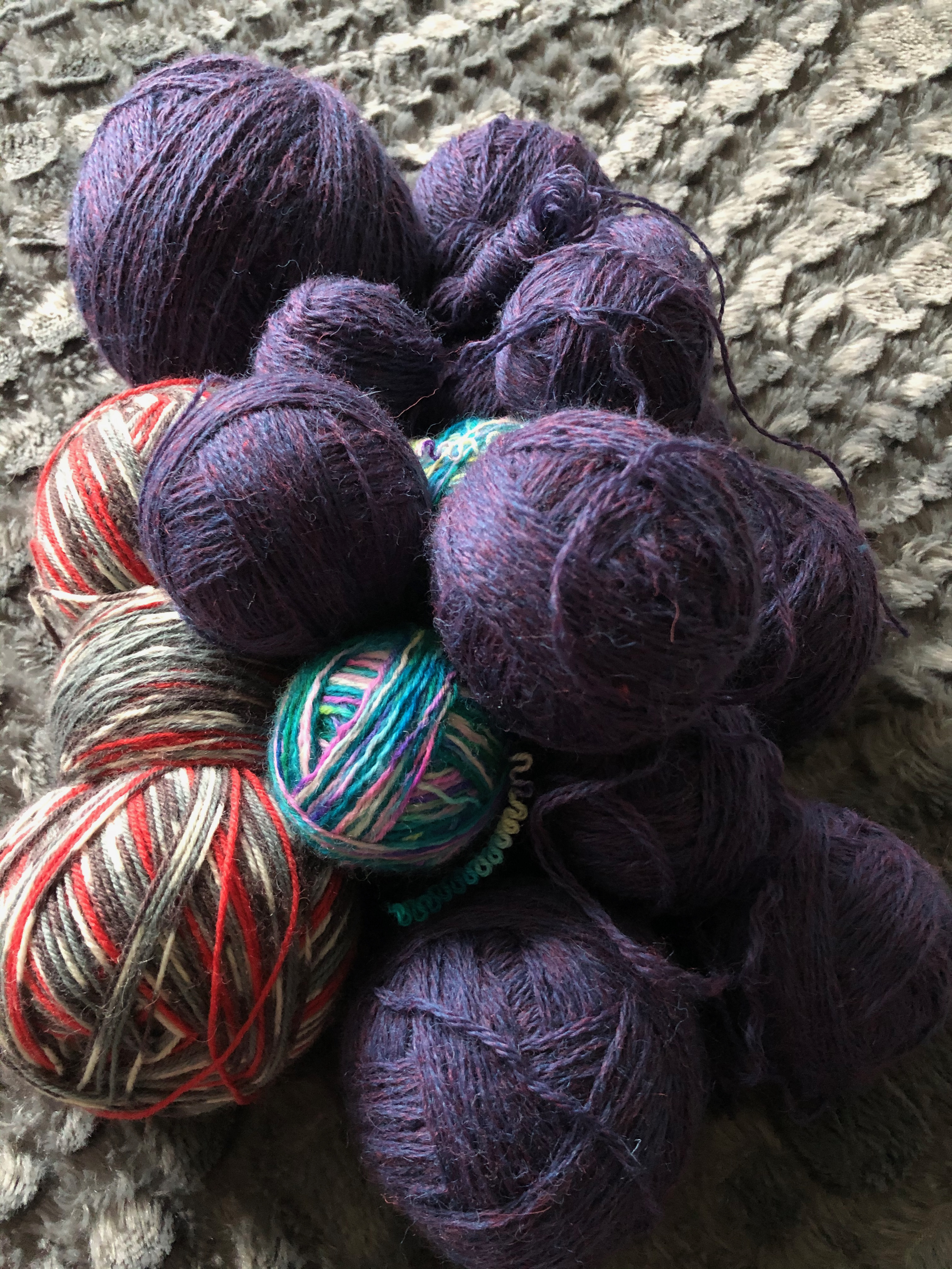 I’m sure you will think of the above photo as showing me wandering over the line into the land of wanton destruction. Here are the three knitting projects I had “in progress” – my Heather Sweater; the socks I was knitting with the contrast ribbing, heel and toe; and the pair of socks I’d misjudged the sizing of. All reduced to a pile of wool. Am I sad? A little, just about the Heather Sweater, but to keep on fiddling with it was serving no purpose: with every tweak I got further away from the desired outcome. In fact, I would go so far as to say it’s closer to being a finished object here than it was before I unpicked it all.