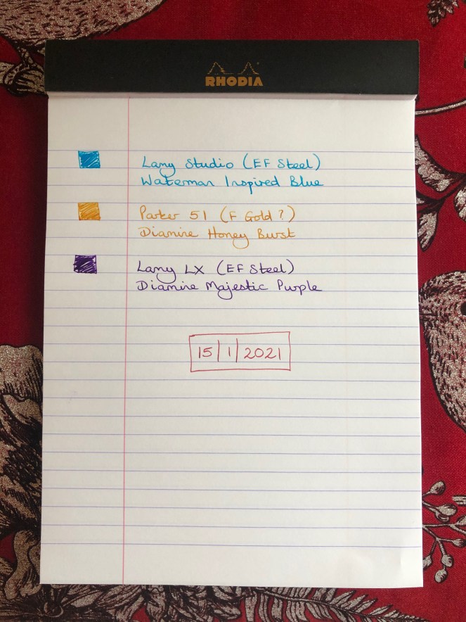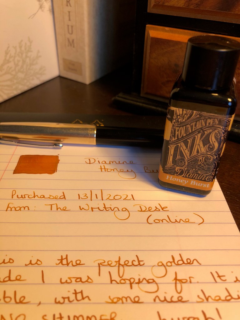I mentioned in my last post that I was going to talk more about the inks. For the past few months I’ve been determined to have a little more focus in my ink collection and there’s one ink in particular that I was keen to try and use up. Then boredom struck. I began to feel envious of the long “currently inked” lists on YouTube and Instagram and I inked up several pens which only partially eased my cravings. Earlier in the week I was watching the latest selection from Penultimate Dave and I had to pause it after he wrote the first three examples because the colours just looked so cool together. First, he had a marine blue, then an amber, then a lavender purple. I have a blue which isn’t a million miles away from his marine shade and I have a purple that was close enough to his lavender, but I didn’t have anything which even vaguely resembled the amber, thus my search began for a shade to fill that gap. Diamine’s Honey Burst has proved to be exactly what I wanted, providing a brighter, more tangy hit of colour whilst still being legible – once you start looking at yellow inks you can quickly get into the realms of the practically invisible. I also wanted to ignore the shimmering inks which are very popular at the moment and that’s one reason I specifically avoided using “gold” for my search even though I was really looking for a golden yellow. Honey shades, sitting towards the orange/brown end of the yellows, provided me with plenty of options.