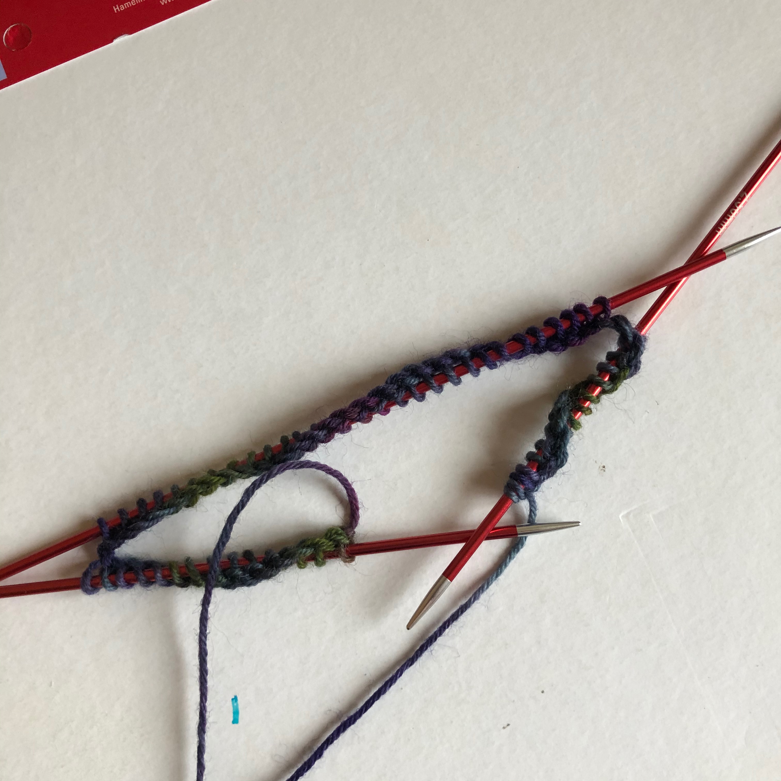 For almost all of the years I’ve been knitting socks, I’ve worked the cuff as a flat piece on two needles and then joined it into a circle, adding in the third and fourth needles, when I move from the ribbed cuff onto the leg. The advantage of this is that I have a nice flat piece of fabric and it’s easy to make sure I’m not twisting it as I join it into a circle. The disadvantage is that I have to sew the cuff together once the sock is completed and, especially on self-striping yarns, that can look messy.