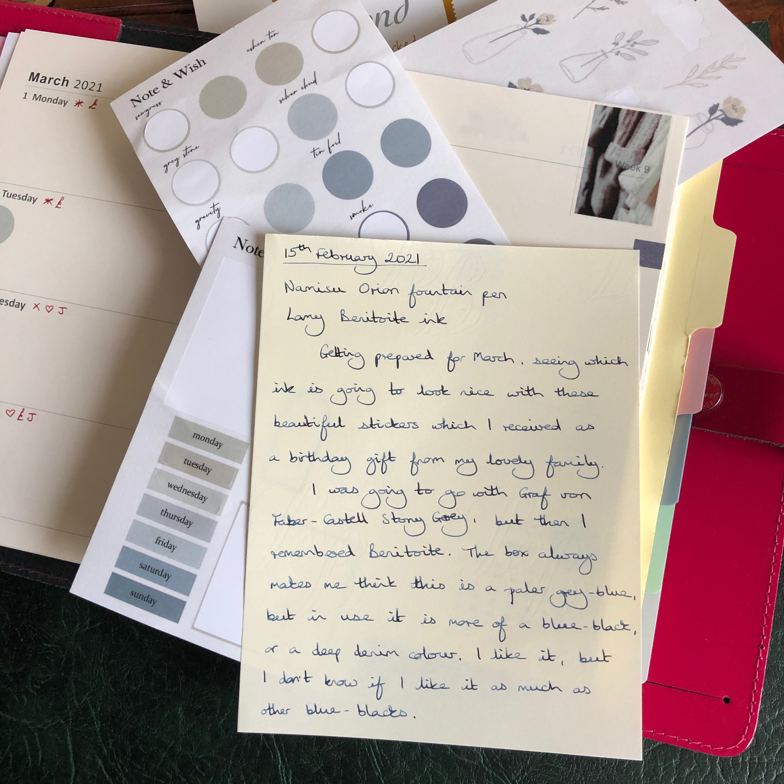 I think the Lamy Benitoite is close to perfect this time. Whilst it is never the colour I want it to be, it is just muted enough to work with the various shades in the stickers. I would be lying if I said I hadn’t looked at other ink options and if I wanted to buy another ink I could, I think, have come closer to my vision. Yet shopping my existing inks has given me more pleasure and saved me money; lots of money, actually, as the shades I liked were all from the most expensive brands.