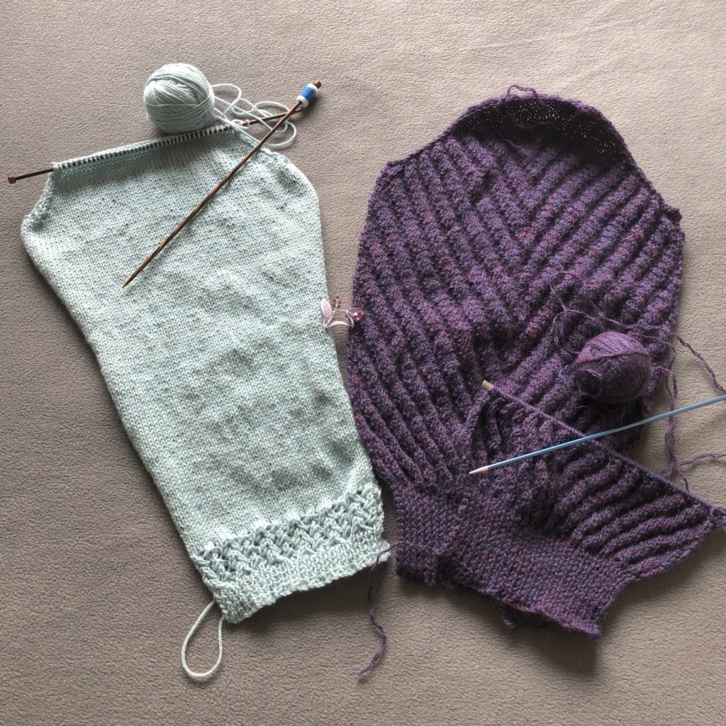 One thing you may have noticed, however, is that I am making a great amount of progress on my Lace Panel Sweater and perhaps falling behind a little with the Slope Rib Sweater. I must admit that I’m more drawn to the pale blue wool at the moment. Has the daylight changed? Are we heading into the clearer light of spring? I often find that affects which colours I want to work with. I’ll probably allow myself to finish the pale blue sleeve, which will probably happen today, and then turn my attention to the purple one.