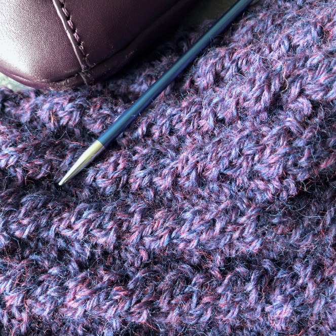 I’ve picked up the Heather Slope Rib Sweater again and resumed my steady amble through the second sleeve. I’m just above the elbow now and that’s reasonable progress. When I get to the back and front things will be slightly more interesting. The back is mainly the slope rib pattern relieved by a straight rib ‘yoke’ for the top five or six inches. The front will be my winging it area, interpreting the cardigan instructions to turn the garment into a sweater and working out how to make the mock button band work. The thing is, until I begin the front, I have the option to just follow the pattern and make a cardigan, so the future of this project retains a pleasing degree of fluidity.