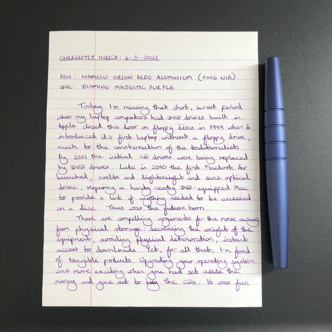 The first of my three pens is the Namisu Orion which stays in my Filofax. Filled with the lovely Diamine Majestic Purple ink, it is a great everyday writer and, if I ignore the little voice inside my head asking me if I’m really committed to the Filofax, everything on that front is perfect.