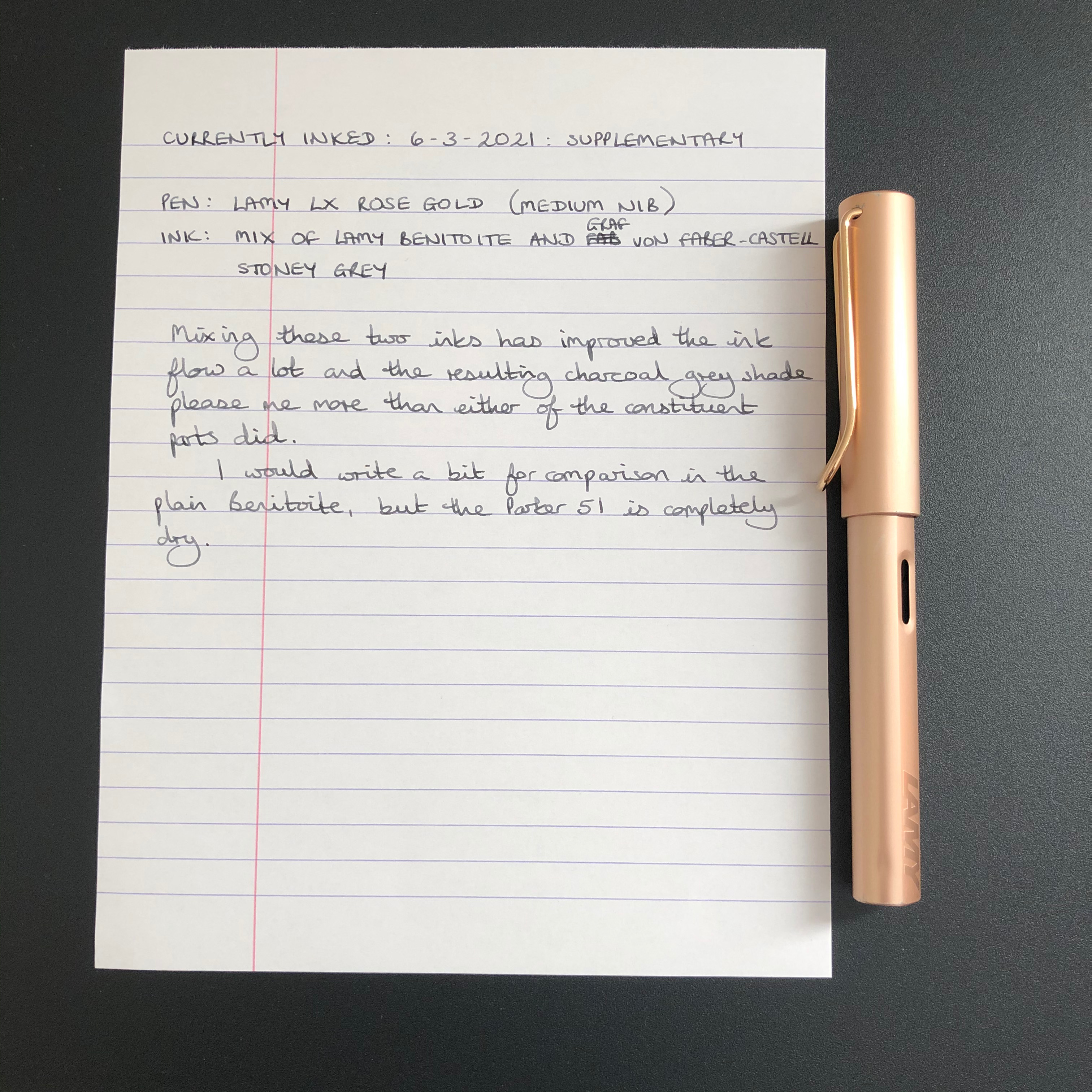 Whilst I would like to try another combination, the Parker 51 isn’t the right pen for the job due to the filling mechanism. I feel that a cartridge/converter pen is best because I can mix a small amount of ink and fill the converter using a syringe.