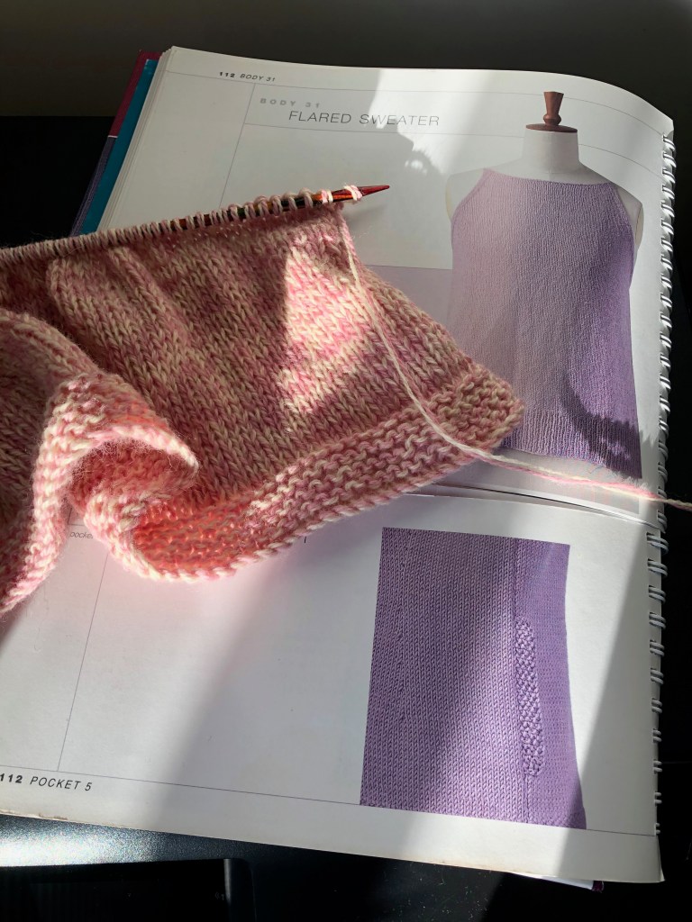 I’m following another pattern from the One Thousand Sweaters book by Amanda Griffiths, this time using the “Flared Sweater” body design to provide a slightly A-line shape with extra width at the hem. Once I’m up to the armhole shaping, I will switch to one of the other design options to provide me with a nicely fitted shoulder and my favourite set-in sleeves. At the moment, I’m favouring a cowl neck which would be nice and cosy, although I’m mulling over ideas to get a bit fancy with that element.