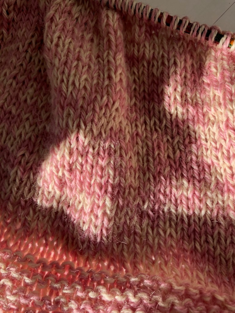The moment I decided to combine the pink wool with leftovers from previous cream jumpers, I knew that I would be referring to this project as Coconut Ice. High contrast has its place, but I do enjoy a bit of subdued marling, using tones like these which meld softly together.