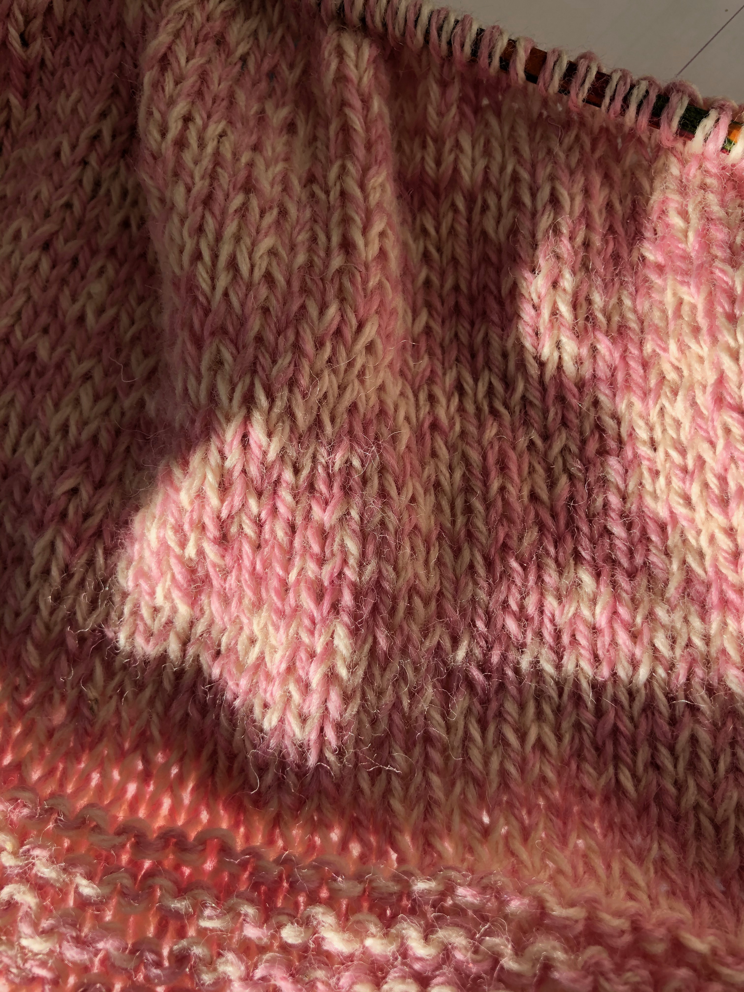As it’s written, the pattern has ribbed hems, but this wasn’t really the look I was going for, so I started off with a rolled hem. After I had about two inches of the body finished, I realised the rolled hem was going to be awful, so I took it back to the cast-on edge and worked a band of garter stitch instead. I’m really happy with this decision. I should point out that this hit and miss approach is intentional, I’m ready for a project where I fly by the seat of my pants and am not daunted by trying out ideas and abandoning the ones that don’t work.