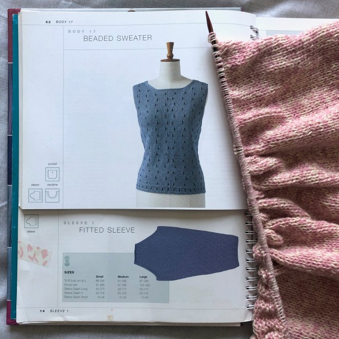 There is going to be a big change when I get to the armhole. Although I occasionally wear a raglan, I generally find a set-in sleeve provides the best definition to my narrow shoulders. As the Flared Sweater gives instructions for raglan sleeves, I’m going to swap to the instructions for the Beaded Sweater which has the combination of set-in sleeves and scoop neck I’ve decided upon for my jumper. I’ve checked the most important thing: that I will have the correct number of stitches on my needles to work the shaping for my set-in sleeve. In this case the number of stitches is exactly the same for the two armhole designs, so it’s a fairly simple modification.