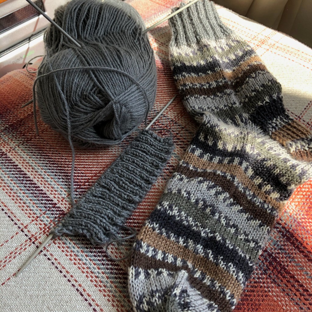 I’ve had an interesting week immersed in my novel-editing (I ramble on about my progress over at 16SixtyWriter if you’re interested) and have barely picked up my needles. Even so, I have one sock finished and I’ve made a start on its partner. What is odd is that I haven’t really mentioned this pair of socks apart from showing the two yarns before I started knitting. So here is the halfway detail.