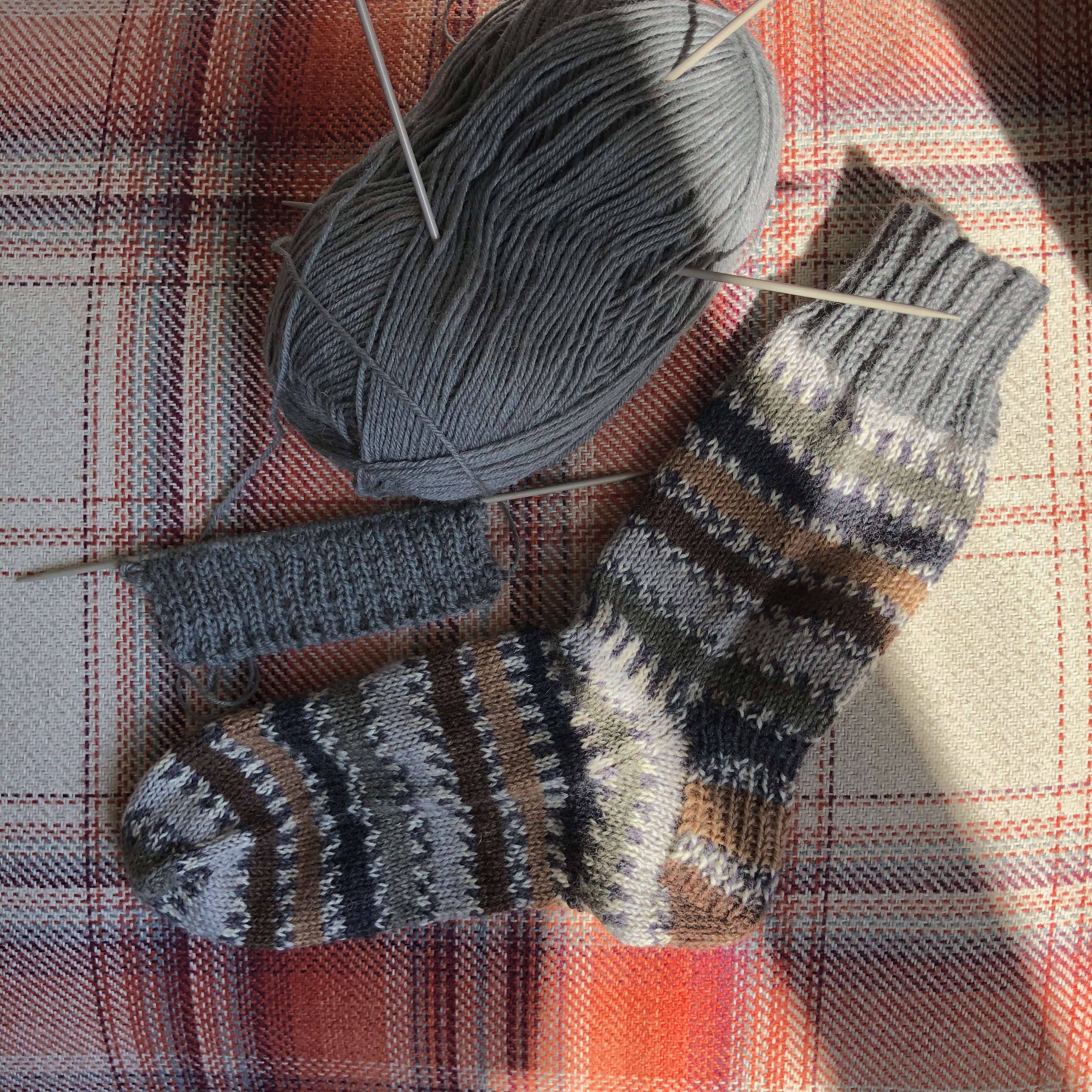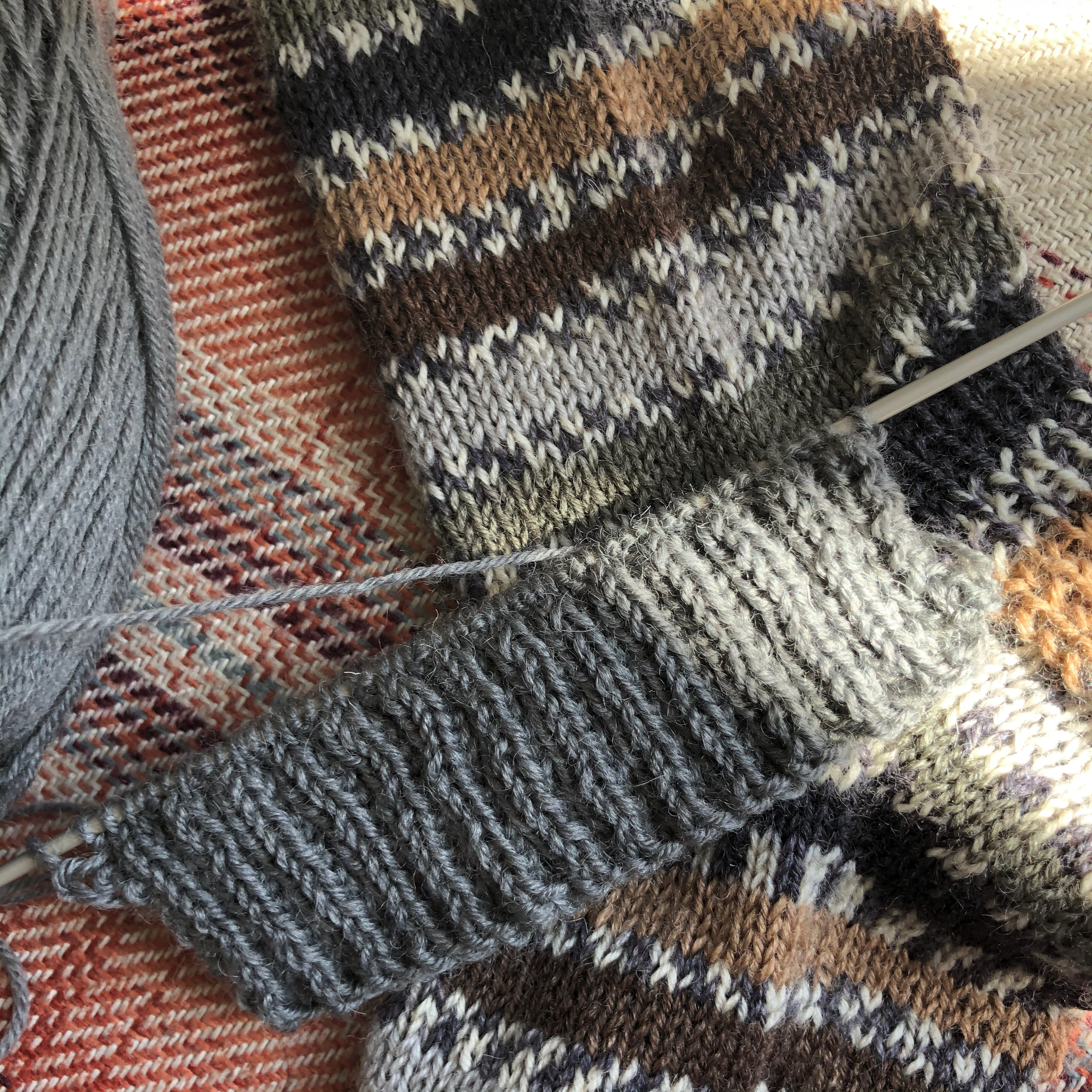 Whilst these are just my normal vanilla socks, from the free pattern that came with some wool somewhere in the Pleistocene era, and the yarns are tried and tested varieties from West Yorkshire Spinners, I have one single reason for counting these as an experiment. Having been struck by how sloppy some of my socks feel at the moment, I thought I’d try working with less stitches, so I’m knitting on 56 stitches instead of my usual 60.