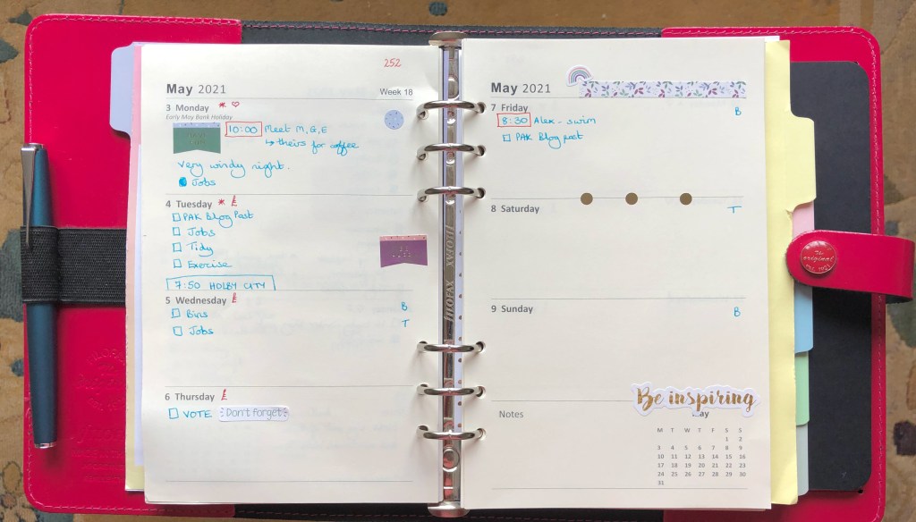 Another minor irritation is the feeling that I under-use my Filofax; I sometimes find myself wishing that I was a more avid note-taker, but I rarely come across anything I need to jot down. Shopping lists go into a separare little notebook in my wallet, and I’ve set up a Pen and Ink Journal so notes about that side of life are kept separate. I find, particularly when I consume the output of planner “influencers”, that I have an irrational desire to engineer situations where I can use the Filofax, and that is something I try to resist. The point with anything like a planner is to have the equipment to hand when we do need to search for a date or take notes rather than creating situations to fit the desire to play with our toys.