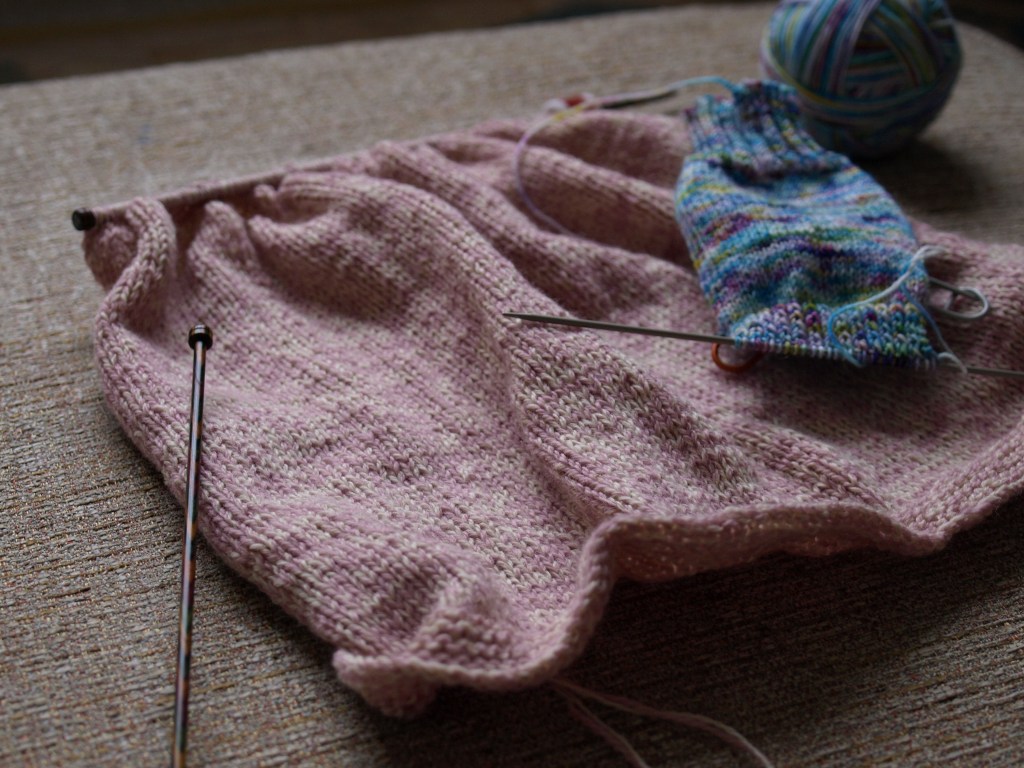 I love the colors of your knitting here, especially the sock. I agree that sweaters can be a little boring after most yokes, but I tend to like that – the ease of the stockinette is sometimes really good for me because I can read and stuff while doing it. Sometimes if it’s a colorwork sweater, I’ll add a version of the colorwork at the bottom to put some interest back in