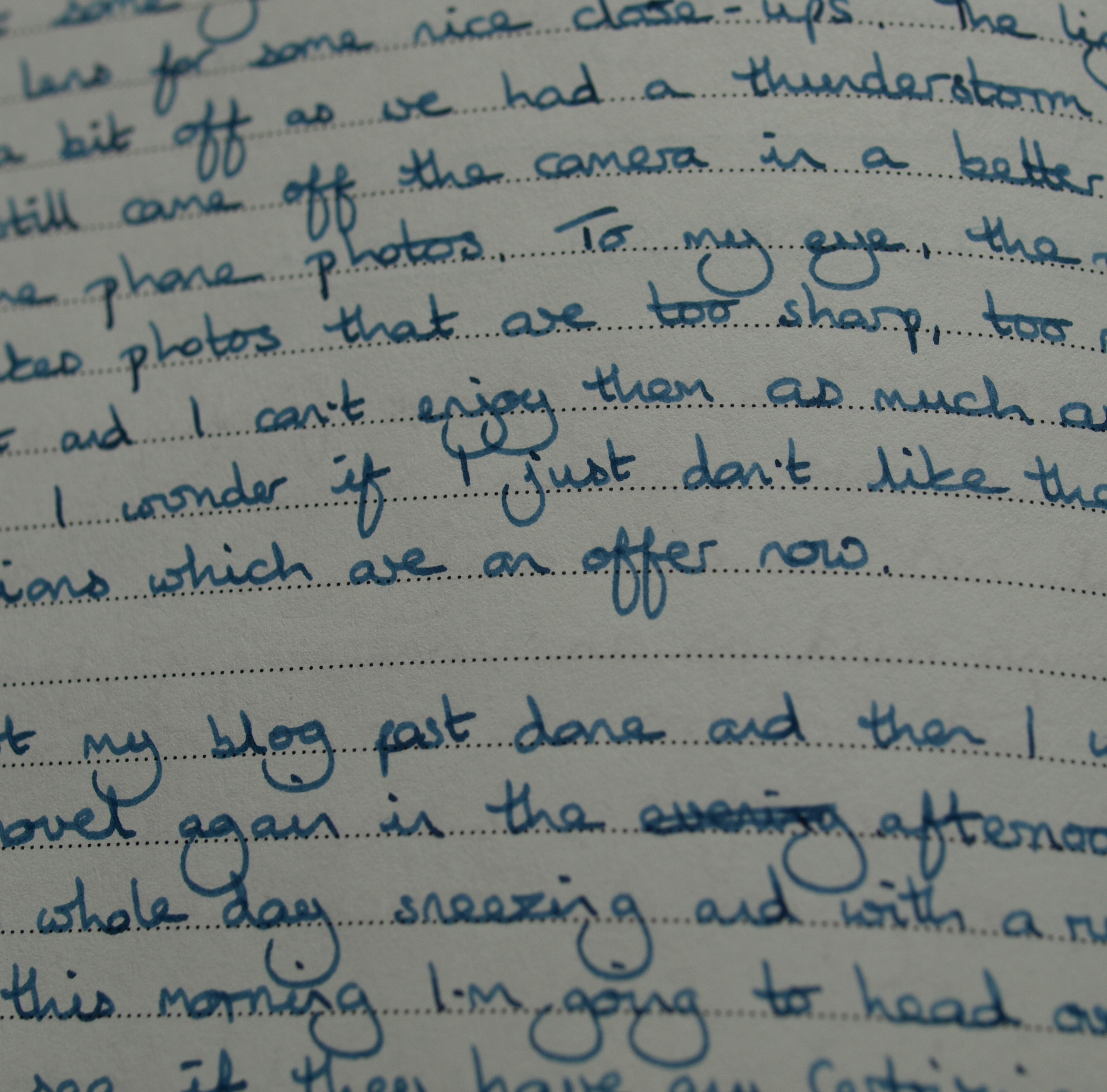 See how much crisper the lines are on a less absorbant paper? That, too, helps with the overall feel of space on the page when it’s filled with handwriting. I might just about cope with the 6mm line ruling if the paper in the “Spark” notebook was coated and gave a crisper definition to my writing; as it is, the ink spread combined with the close ruling drives me round the bend.