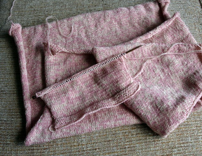 So, the back finished and a sleeve started, I’d be pretty pleased if that was the sum total. But I have to confess that I’m being tricksy because this photo doesn’t show the back and a sleeve at all – it’s two sleeves.