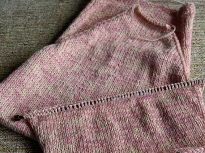 Indeed there was. In fact, I got the back finished quite quickly; I was right about how rapidly it goes once you start decreasing for the armhole shaping. The first photo in this post shows a sleeve I started on Sunday night and I’m pleased with the amount of progress I’ve made on that.