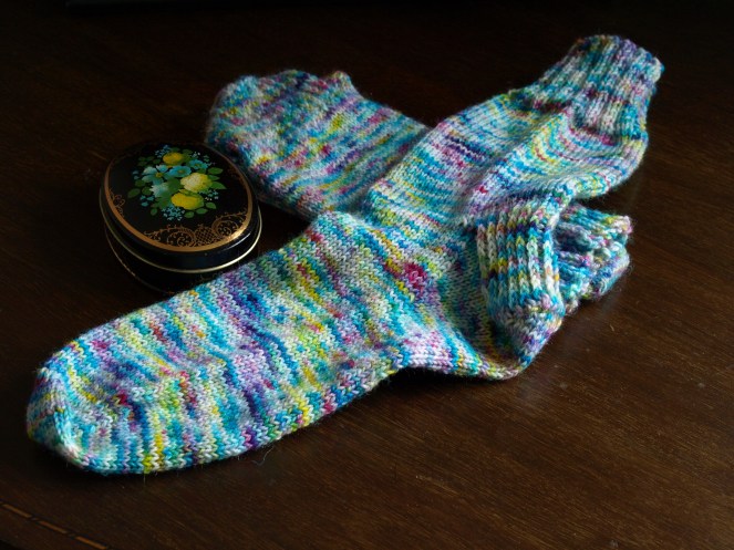 I have, though, achieved one little thing and that is to finish the fourth pair of socks in my self-imposed Six Socks challenge. I took my time over these, but had a big push over a couple of evenings to get them done. I love the finished result – the dyeing of this yarn (Speckled Eggs on the Sturdy Sock base by Noodle Soup Yarns) is spectacular. It’s going to be a lot of fun wearing these, especially come next Easter. I’ve ended up with exactly 25g of the yarn left over for another day. It would make lovely linings for either a collar or pockets on a plain dark garment. It’s an effect I have always been fond of: that semi-hidden flash of excitement in an otherwise sober outfit, the garish back to a grey waistcoat or the man who lifts the leg of his business suit to reveal his navy blue socks have a superhero on them. Silk ties! Should I admit that I follow some random man on Instagram who posts photos of his lovely suits? No, probably not!