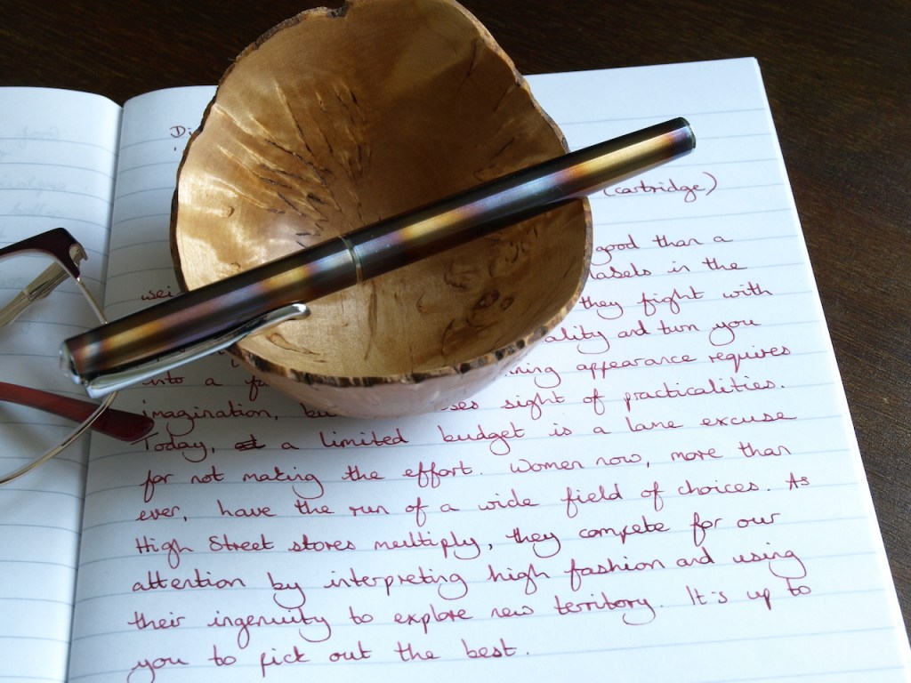 As to the nib, this is the Fine version in Steel – I have found it to have a nice ink flow, not stingy but not by any means a gusher. Being steel, there’s nothing too fancy going on in the way of line variation, but that’s not the point of a pen like this. The nib is smooth and pleasant to use and it wrote perfectly out of the box. I did give it a quick flush through with water before the first fill. I’ve chosen to christen it with a cartridge of Diamine’s Burgundy Royale ink which I think pleasantly flatters the warm tones in the pen’s finish.