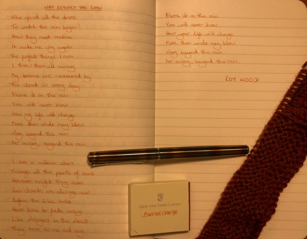 Oh, yes, I’m feeling those autumn vibes now. The ink, the paper, the pen, the knitting, all illuminated with late-evening lamplight, and the glorious lyrics of Roy Wood underpinning it all.