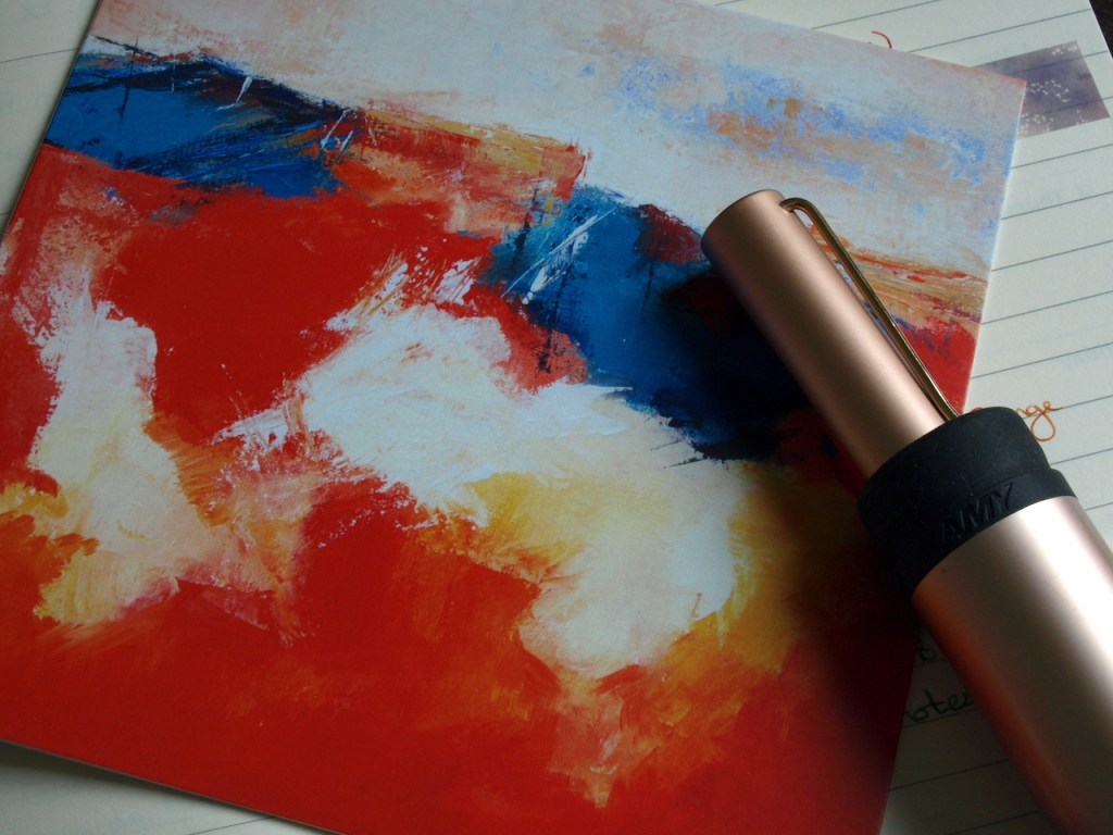 I saw five (or two, depending on how you look at it) works that I would happily have bought and hung on my walls, but luckily I’m guarding my money closely for the next couple of months. One picture was of a large vase of flowers and I was particularly drawn to the colour choices, which were slightly at odds with my usual taste. The background combination of a warm-toned pink and a citrus green initially jarred, yet as I studied the picture the whole effect made me feel very happy and I think it would be great to have such a joyful item in my life. The other four formed a set, although any one would have been lovely on its own. These were tiny abstracts in shades of blue and white, with a feel of swirling seas about them. They were neat and calm, and so very much in line the things I usually opt for that they could have been painted especially for me.