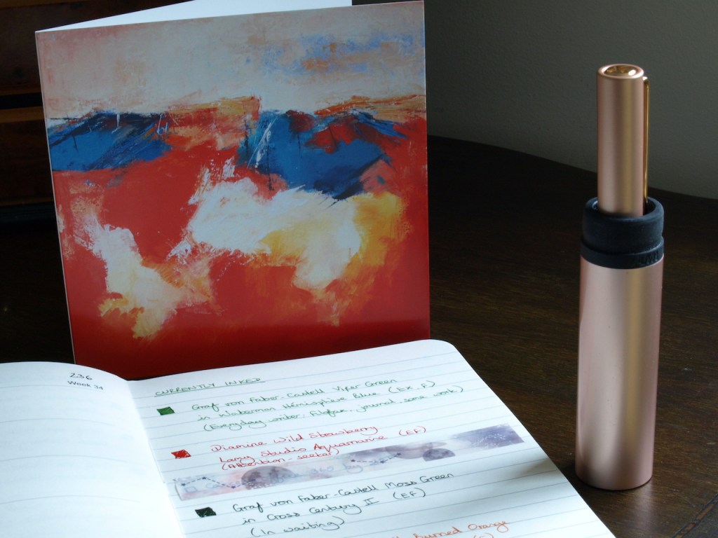 My friend very kindly bought me two cards as souvenirs of the exhibition. My choice included one which depicted a work by Corrin Tulk, titled “Renaissance”. This was a perfect piece of serendipity and of course it had to come home with me, if only in miniature greeting card form.