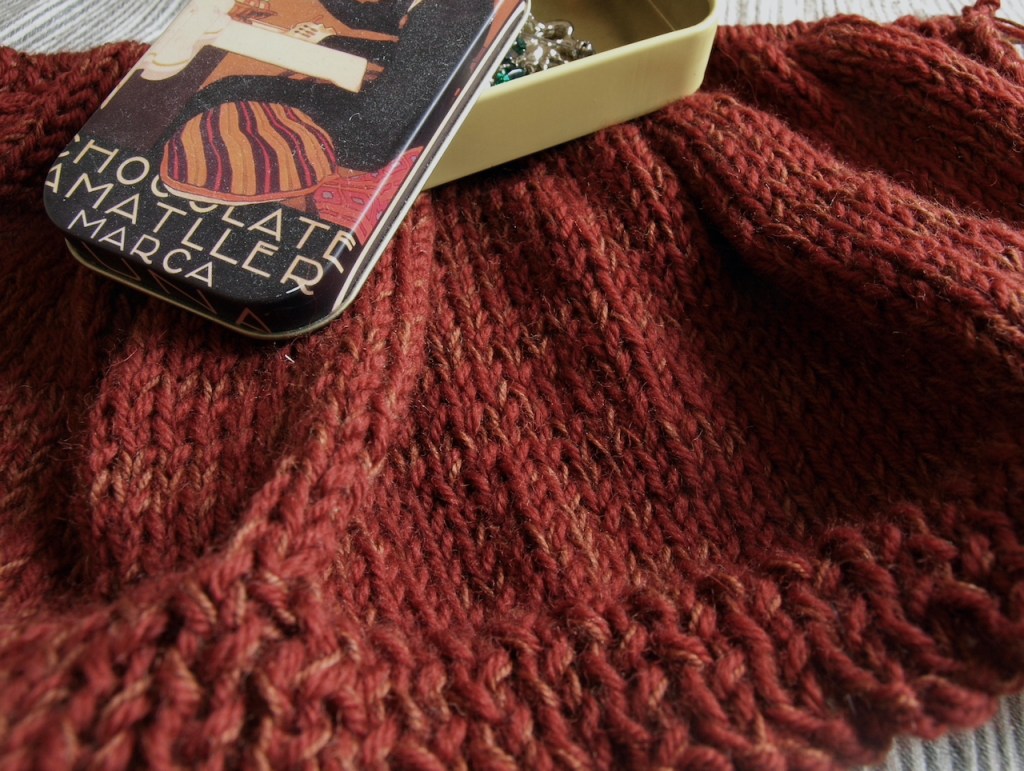 When I started this for the fifth time, I wasn’t holding out any hope. I had decided to go up a needle size because the fabric felt too dense using 4.5mm needles, but I still wasn’t convinced that this yarn choice was going to work out. Worse yet, I was pretty sure the item wasn’t knitting up to the size I wanted. I had an idea that it might seem better if I used a circular needle for the knitting as it would allow the width of the piece to stretch out and might give me a better feel for the size, but then I found I didn’t have the correct size of circular needle. This gave me the push I needed to think what the heck, I’d just plough on and either finish it and work out who it would fit, or give up on it later down the line. Sometimes I over-think things and I don’t start enjoying them until I stop thinking about them. This is definitely one of those times.
