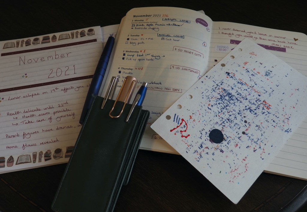 Speaking of pens and inks, I ended up with four pens inked for Fountain Pen Day this past Friday, 5th November 2021. I already had my Waterman Hemisphere Rose Cuivre filled with Diamine Burgundy Royale which is a lovely shade for Autumn. Unfortunately I didn’t like how it worked with the emphasis colour I’ve got going at the moment – Lamy Crystal Ruby in my Lamy LX Rose Gold pen – so for the week leading up to Fountain Pen Day I’d gone back to the Graf von Faber-Castell Cobalt Blue which is in my Cross Century II. The red and blue inks contrast nicely.