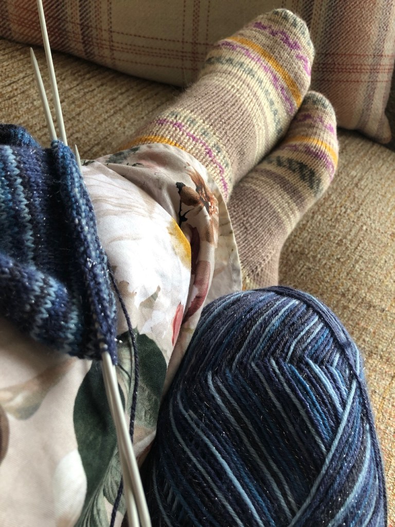 Speaking of sparkles, what about this sock yarn? I don’t think I will ever want more than one pair of sparkly socks, but this yarn (West Yorkshire Spinners’ Signature Sparkle 4-ply in their Silent Night colour) called to me for my Christmas break knitting. I like that the underlying dye-work is relatively subtle compared to some of the wham-bam effects when sparkle is combined with a bright and busy colour combination. I might not finish the socks before I start back at work mid-week, but I aim for them to be done by New Year. Since I like to enjoy a “Silent Night” on New Year’s Eve, I think these will be very good to wear that day.