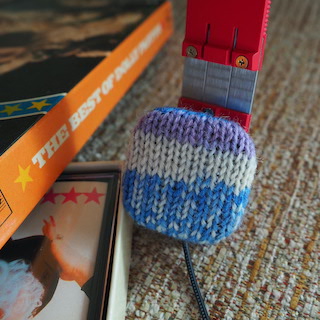 Of course, if I’d wanted to be fancy, I’d have picked a yarn which co-ordinated well with the pinky-red of the headphones, but funky colour combinations work for me and the purple tones are complementary. Maybe when these covers wear out I’ll make another set and put a bit more thought into the yarn colour.