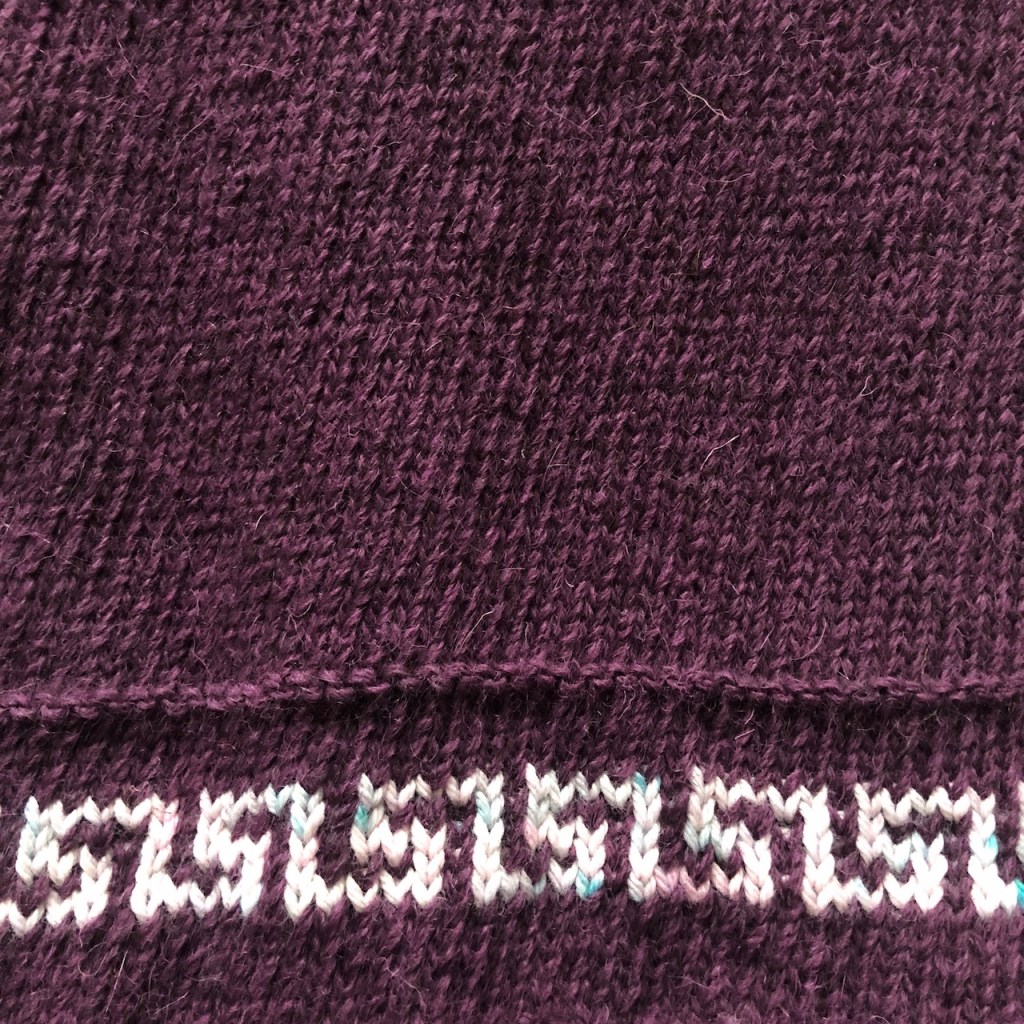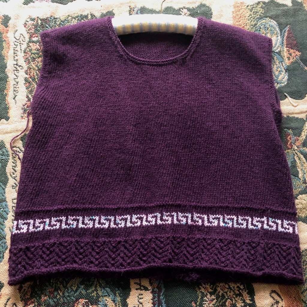 There are two elements in this version which, looking back at the photo, I really like. The first is the neckline and the second is the arrowhead lace I chose to work at the bottom of the piece. When I knit a version for myself, those are the things I’ll replicate. Oh, and I think I will replace the colourwork and do the Greek key pattern as a textured element in my own top.