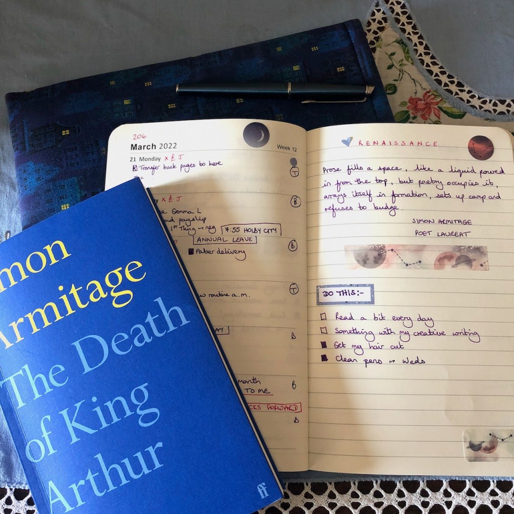 I set aside a fair amount of time for reading and finished the novel I was immersed in on Thursday. So my bus journeys on Friday gave me a chance to start the Simon Armitage poem. I wasn’t sure I’d enjoy it. I thought it might be a bit dry as it is so long. I am glad to say I was very wrong. I smiled all the way to work, charmed by the wordplay. This is actually a translation/adaptation of the Alliterative Morte Arthure and if you’re partial to a bit of alliteration, this has it in buckets. Buckets bedecked with boisterous bells, in fact. Buckets from Berlin, Budapest and Bognor. Buckets beloved by Sir Bedevere himself.
