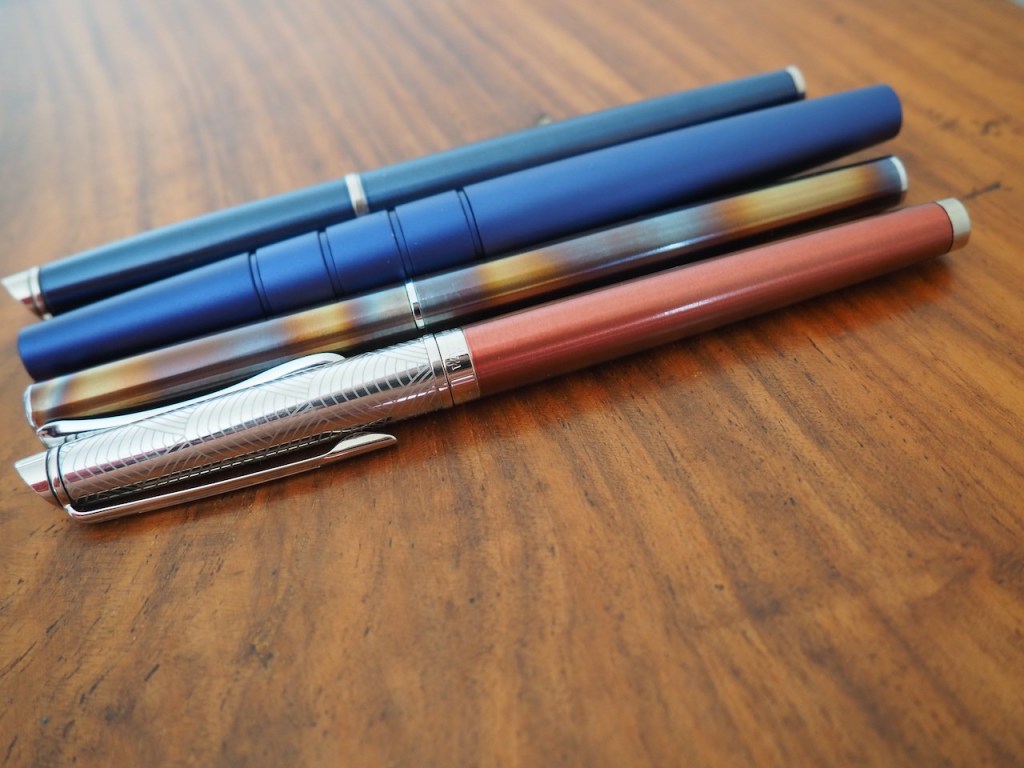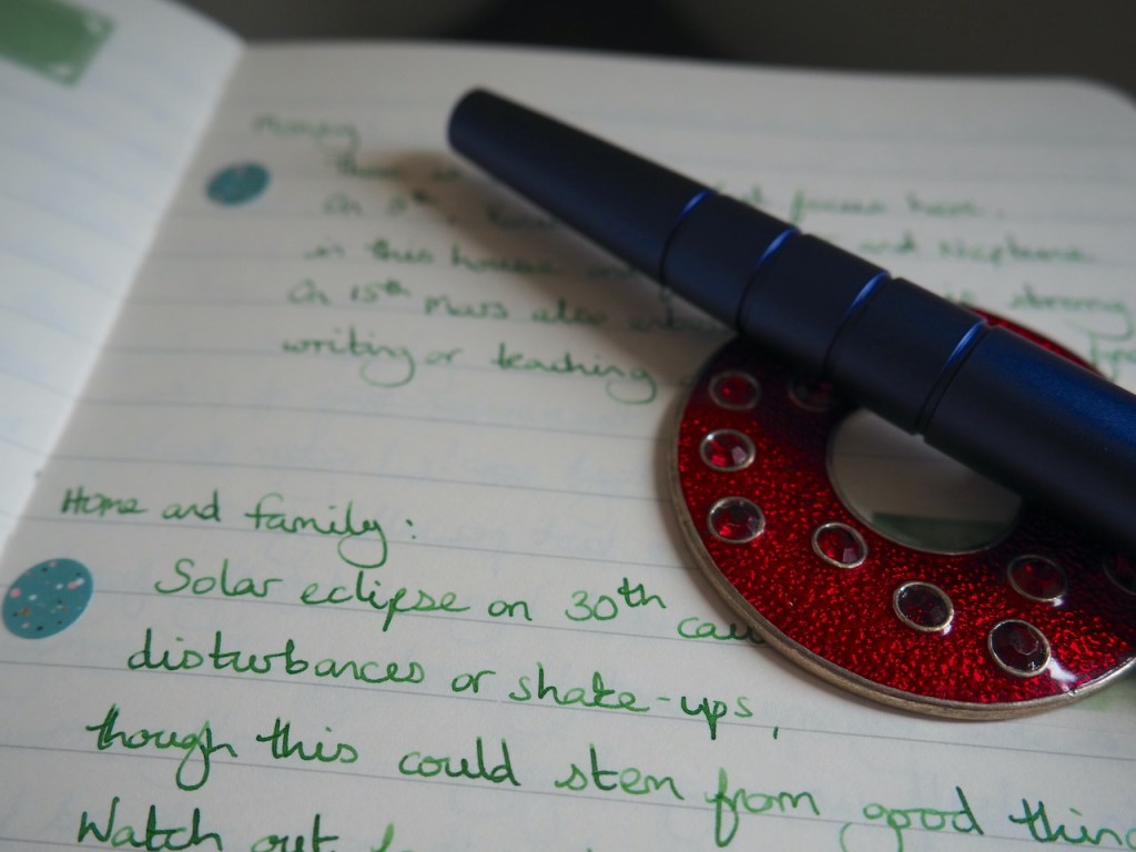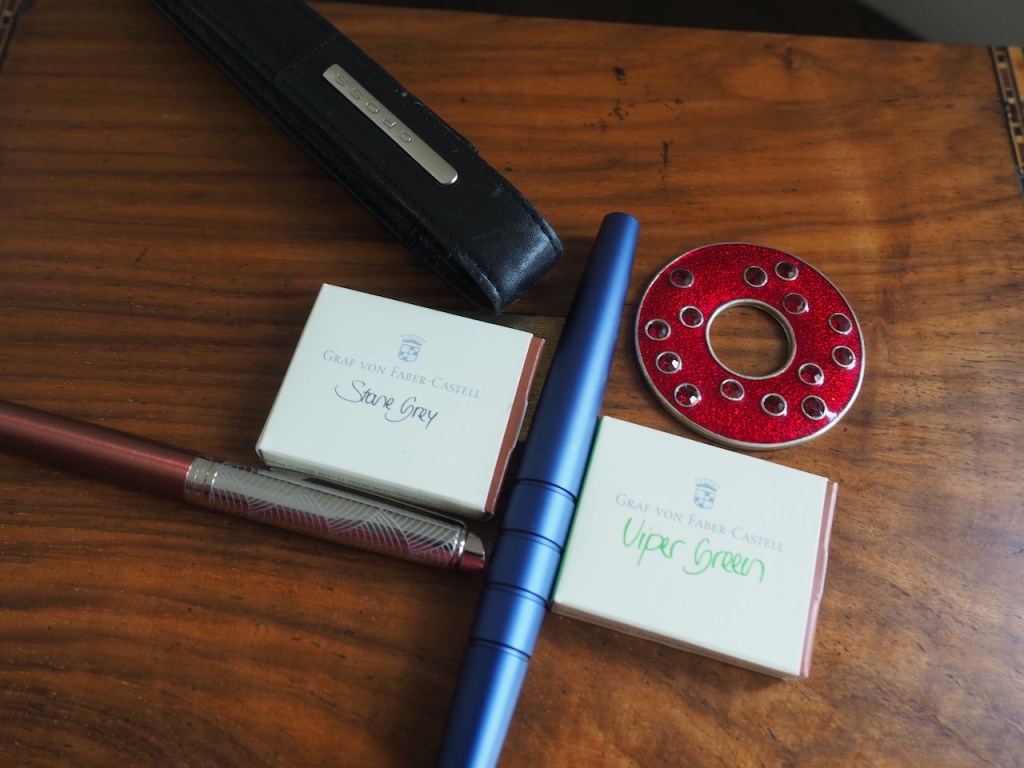 By the way, I’ve been on the search for a pen rest the past couple of months. Something that a fountain pen could balance on for photography, which would hold it in place as pens are inclined to roll when they are not firmly grasped. A little ashtray would have been ideal. Yet nothing has seemed quite right until today when I pulled that red disk out of my jewellery box. The little glass gems stand proud of the surface providing furrows that the pen can rest in and it worked well for these photos so it could be a solution.