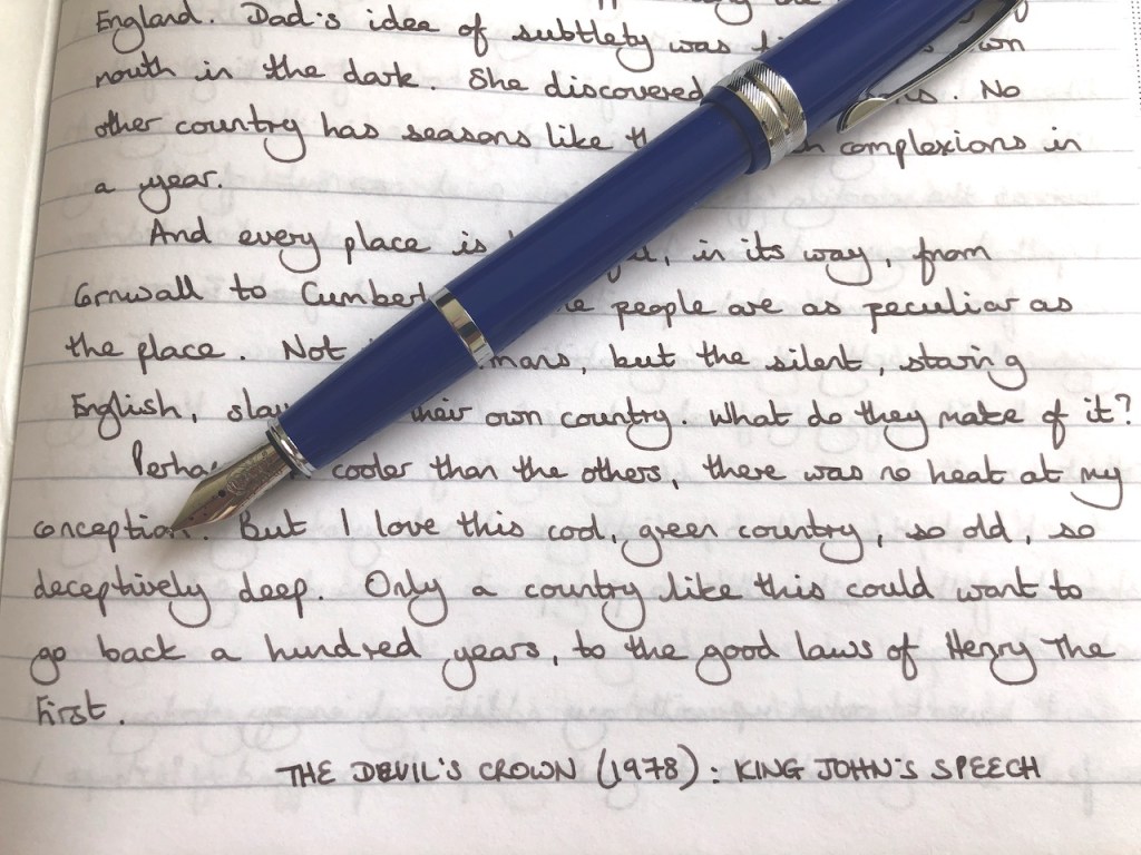 I like to start each journal with a quote and I chose a speech from the 1978 BBC series, The Devil’s Crown. This is from the final episode where King John (you remember him from all the Robin Hood films) was waxing lyrical about the last country left to him of all that he inherited from his brother King Richard (The Lionheart – you definitely remember him from all the Robin Hood films – he’s a lot like Sean Connery!) whilst being pressured to grant the Magna Carta. I loved this speech so much when I recently watched the series again, but it made me smile that it refers to the English harking back to the good old days. If this had been written today we could interpret it as a bit of a dig at Brexit, but it was written 45 years ago, not long after a national referendum had seen the British people vote staunchly in favour of remaining in the “Common Market” and perhaps the writer is seeing something more enduring within the English soul (for John, in his time, was king of England and Ireland only).