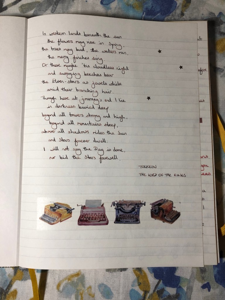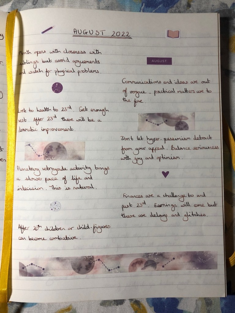 I went for a JRR Tolkein poem to start the book. I’ve used some of my lovely typewriter washi tape here, but I’m putting a strip of narrow washi tape with a star design between entries. After writing my Sunday morning entry, I added a page of August horoscope highlights. Again, this is something I skipped in the Silvine Notebook for July and missed during the month. I’ve decorated the August page with a suitable washi tape showing star signs and planets plus some little stickers from Filofax.