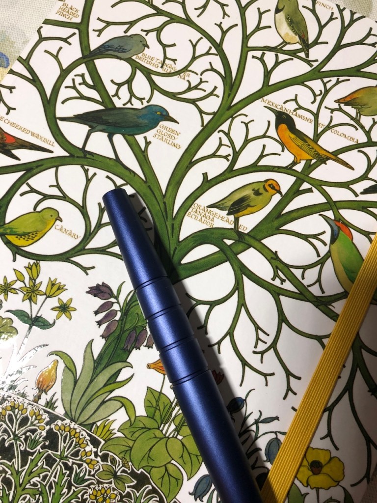 This is part of the Museums & Galleries collection for the V&A with a Voysey textile design called Birds of Many Climes printed on the cover. I bought mine whilst browsing in Waterstones. The cover called out to me with its jolly birds on the stylised tree. It features a gold ribbon bookmark and matching gold endpapers. It is a hardback with 80 leaves/160 pages of a nice ivory-coloured paper. It doesn’t feel as smooth as Clairefontaine or the Silvine exercise book paper, but it’s certainly not toothy. I’ve gone for a larger format than usual with the pages being approximately 240 x 180mm. The line spacing is a lovely 8mm and the ruling is relatively unobtrusive. So far I am enjoying this book a lot.