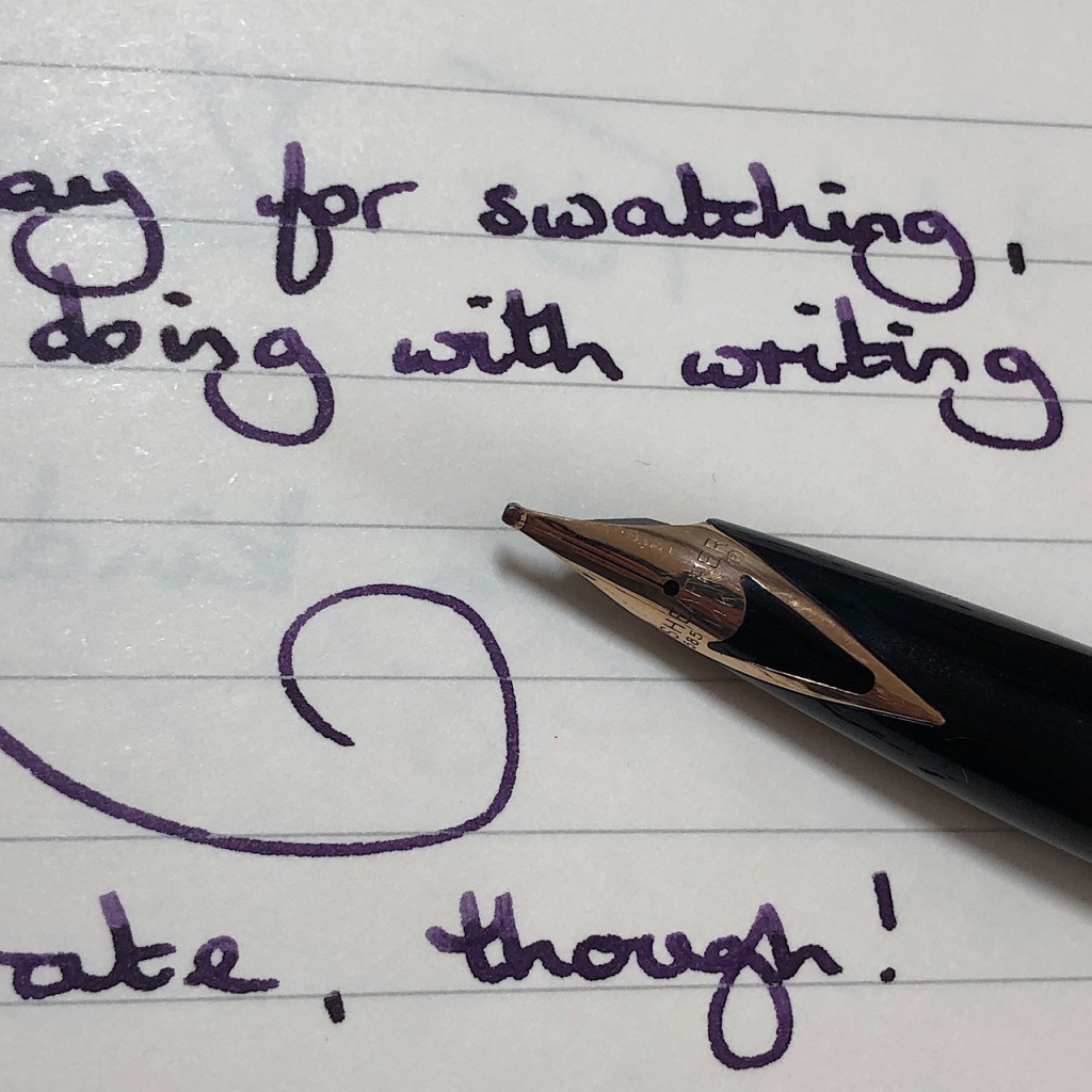 I paid £75 for this pen which I felt at the time, and still do feel, was a fair price. The good news is when I got home and inked it up it worked absolutely perfectly. The slightly worse news is that I made a rookie mistake and purchased a pen with a very broad nib – not my preference at all. I was a little disappointed with myself, but even so felt that there were enough options open to me to make this a good purchase: having the nib ground to a finer point, keeping the nib as it is and using it as a dedicated pen to swatch inks, or using it at times which call for writing with a large, bold hand. The more I look at it, the more I wonder if this could be a good pen to journal with if I explored an unlined book which would allow more room for larger handwriting.