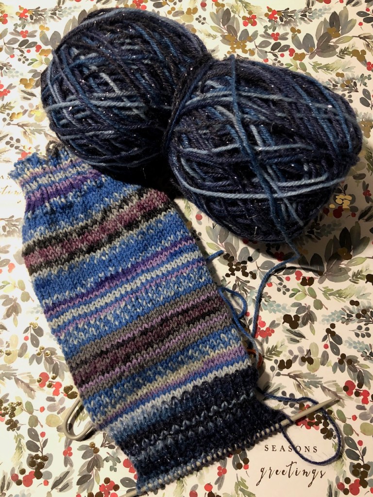 I’m currently working on one pair of socks which I’m hoping to finish between now and the new year. They are “frankensocks” – the legs knit from one left-over yarn and the feet from another. It will hopefully look more intentional than it sounds! The two yarns I’ve chosen co-ordinate quite well together. One standard ball of sock yarn always provides me with enough yardage to knit three socks, so two balls will make three pairs if combined with some imagination.