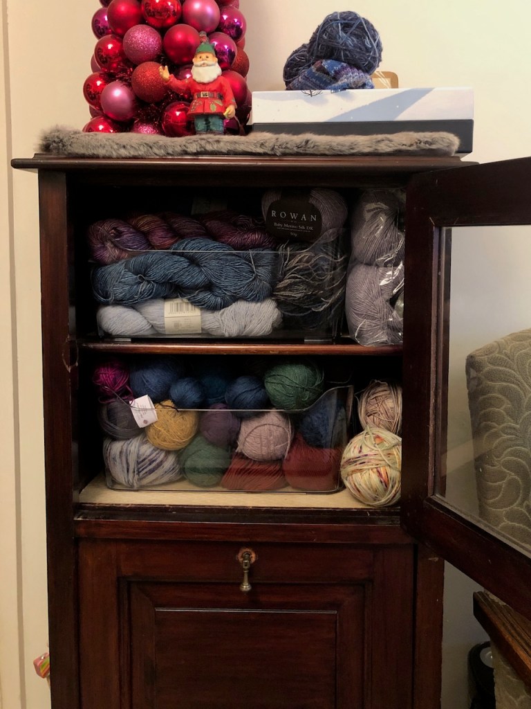 As well as the actual knitting, I’m aware that I need to do something about my storage of both yarn and finished garments. I have the knits that I wear regularly on shelves in my wardrobe, but they tend to get rather jumbled through the week and I’m not always good at re-folding them when I’ve been rifling through them. I’ve been looking at storage options for a while and it boils down to adding some kind of boxes/baskets on the shelves to keep my knits in better order, or putting each knit into a “packing cube” to keep it under control. I haven’t quite found what I’m imagining, so it’s an ongoing search. I’ve done better, however, with the storage for my yarn stock as I recently bought a couple of clear plastic containers to sit in my knitting cabinet. I particularly wanted clear containers so I could still have the benefit of seeing the lovely yarns I’ve got to hand.