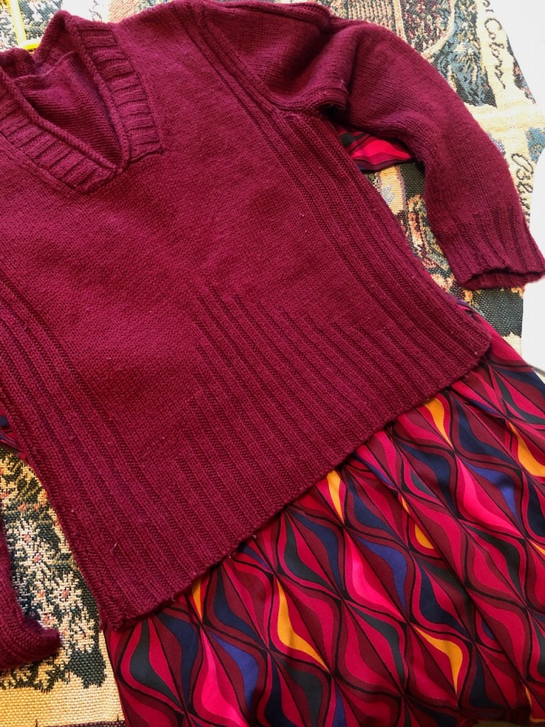 My lovely new “lynchpin” dress has made several appearances over the festive period. Worn with my pink cardi, it took me to a carol service at Norwich Cathedral, and to my office Christmas meal at The Belgian Monk (a lovely place to eat and consume beer if you visit Norwich). I also wore it to my daughter’s Christmas Eve buffet lunch, but this time paired it with the more muted wine-coloured jumper. The pink cardi was paired with grey trousers for a pre-Christmas fish and chip lunch at my sister’s house during the icy weather and looked splendid with my fur-lined boots. So far, I must say the unexpected early winter reassessment of my wardrobe has worked very well indeed.