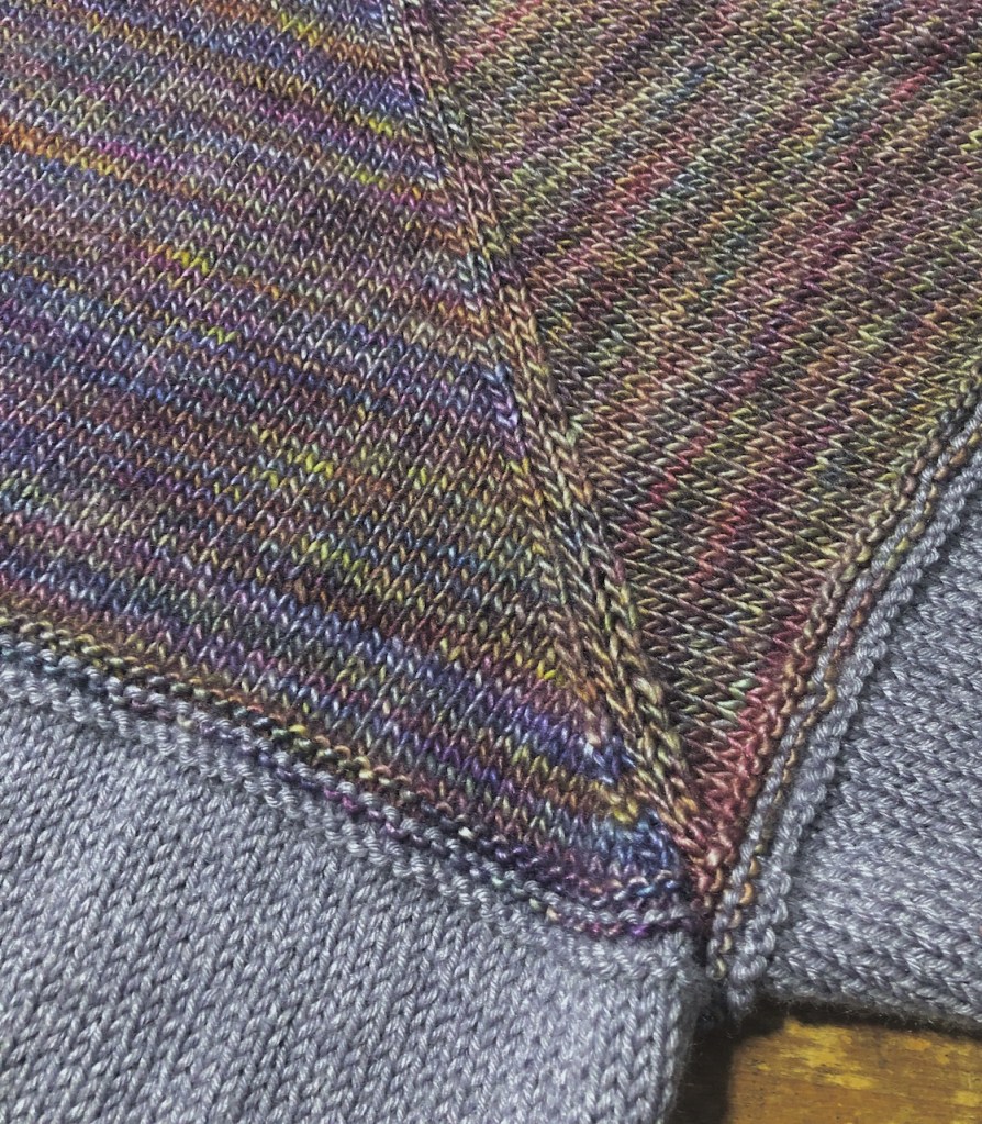 I wanted to do a proper knitting update with lots of spiffing photos, but this picture of a seam is all I’ve managed. The yarns in this cardigan are not easy to capture via photography, and the project is at a point where it has all the gawky ungainliness of an hour-old foal.