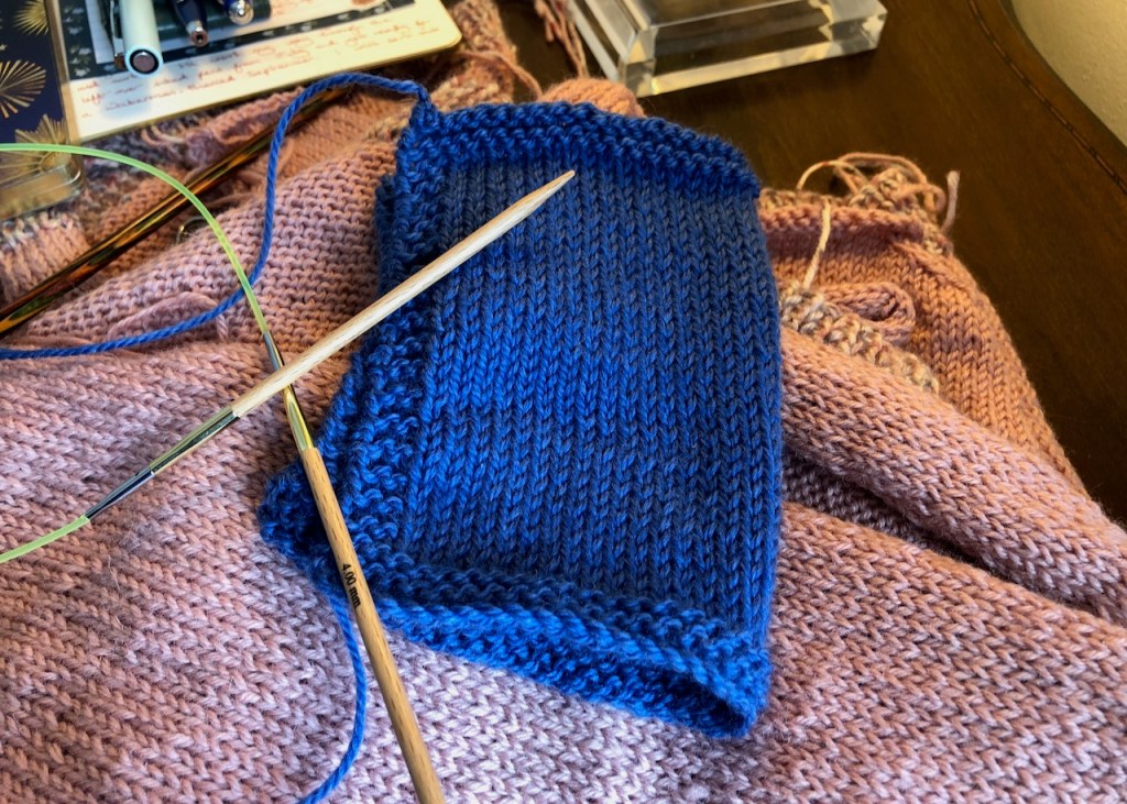 As you can see, I’ve already completed a swatch of the blue wool for my jacket, though I haven’t washed it yet. So long as it doesn’t shrink to an alarming extent, it should be spot-on for gauge, meaning I can knit the smallest size of the garment and end up with a sufficiently roomy jacket. If it shrinks, I can knit the next size up because, technically speaking, either size would work for me.