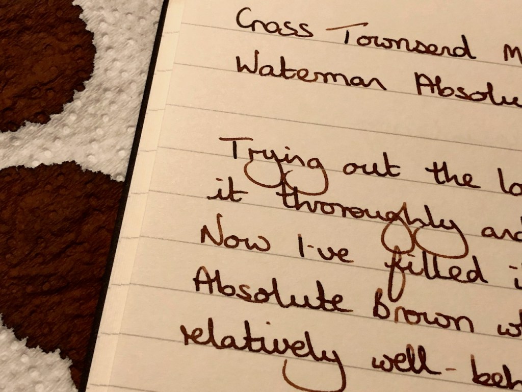 The pen did need an extensive clean-out. There was a significant amount of dried ink in the converter and in the nib, but it was time-consuming rather than difficult to get it all clean again. There is a little staining on the barrel which I’m not sure I can do anything about, though I’m still pondering. Once clean and dry, I filled the pen with Waterman Absolute Brown ink to test it out. My friend had put brown ink in it, so I just went with the same option. So far, so good – no leaks that I can see,