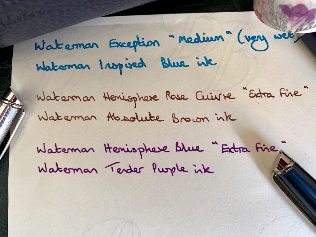 It was interesting to read that you will be using Waterman pens and ink this month. I had 3 Waterman pens in my pen cup last month, a Graduate, Lauréat and Hemisphere. In transport my Hemisphere section broke in 2 . Fortunately it was a clean break, a bit of contact glue solved the problem, so far no leakages. My pens have medium nibs and behave well, they are good pens for daily use.