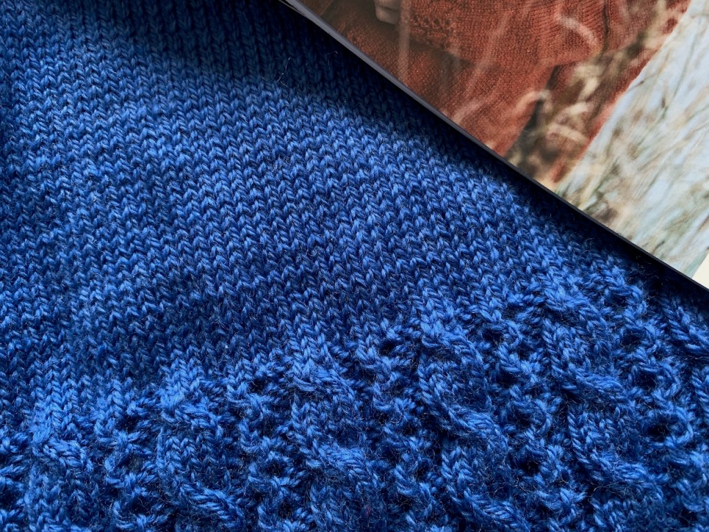 I am already thinking ahead to my future yarn-buying plans, which means much of my non-knitting time is spent browsing yarn on websites. I’m not at all sure what colours I am thinking of to complement the blue I’ve chosen for the Slouch. My heart draws me towards pink, but as I’m wearing my pink cardigans for work I’d like to avoid duplication in the clothes I am keeping for the “not-work” me. Of course, blue and grey is a classic combination and likely to be my final choice, with some pops of mustard yellow and perhaps a green or a nice cheerful red. Yet there’s part of me that would entertain a wild card as one of the main colours and in that case a really good red would top my list. I wouldn’t want it to be eye-searing, but neither would I want it to stray too far towards the burgundy end of the scale. In fact, the Beetroot shade of Rowan’s Moordale wool – the wool the whole pattern book was designed for – looks pretty good to me, although we’d be talking of blowing the budget. I will probably shop my stash for the next garment to give the bank balance a well-deserved rest and that will add another basic blue garment to my wardrobe, perhaps with a bit of colourwork to lighten the mood.