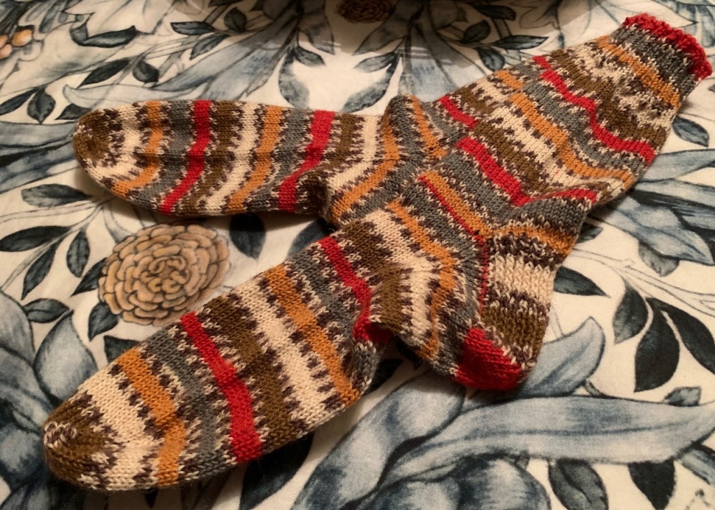 Speaking of progress, the socks simply flew off the needles and are now a finished item. Hurrah! I love the colours in this pair – those red and mustard stripes remind me of the two inks I am using at the moment. These will be an excellent addition to my sock drawer and I’ve completed them at the perfect time as I have one pair in urgent need of retirement. Whilst it’s nice to keep wearing my socks, sometimes they get threadbare and there’s nothing quite like a nice new pair to add a little sparkle to the dull days.