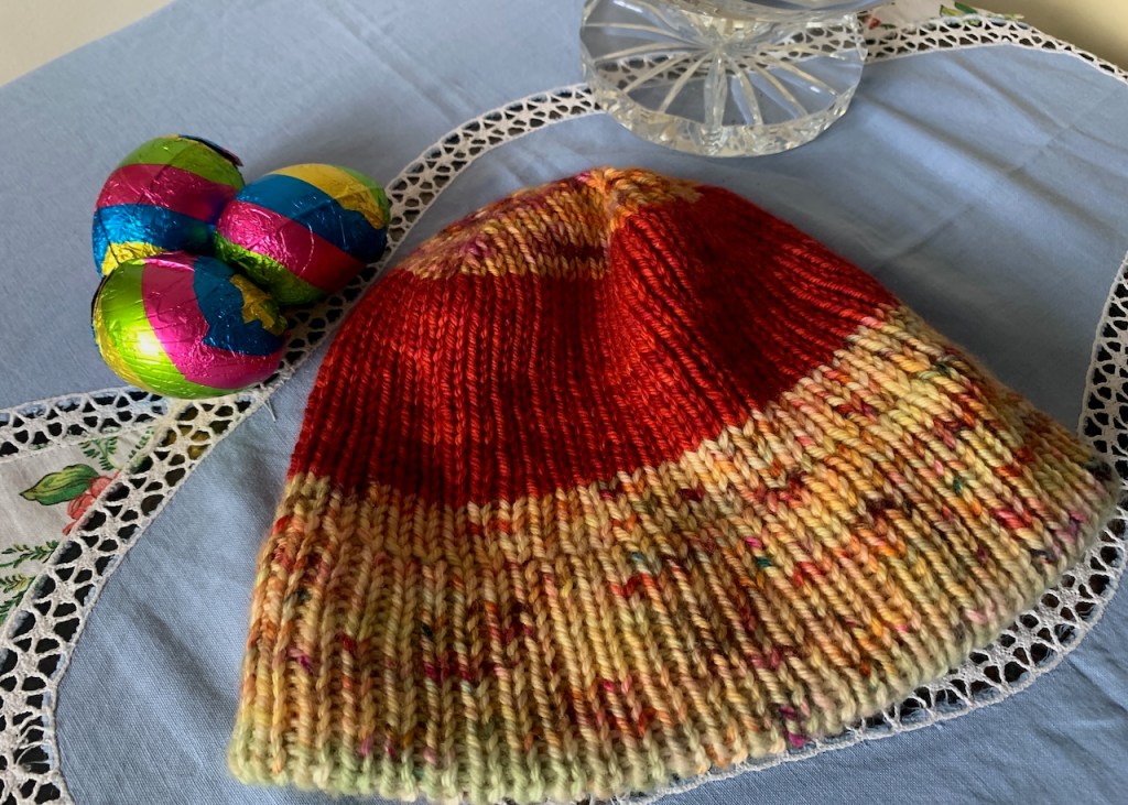 Whilst the commission knit was on hiatus, I took the opportunity to knit myself a quick hat. My previous knitted hat got left behind on a bus one morning on the way to work and I’d spent the winter in a more structured felt hat. I really like a knitted hat, though, because I find they are easier to pack away in your bag when you’re not wearing them. I made the new hat in exactly that same way as I made the previous one – guesstimating the number of stitches I’d need, knitting to a length I thought would be okay, then shaping the crown. The original hat was just slightly smaller than optimum, whilst the new hat is a little larger than ideal, but the marginal “fault” in sizing hasn’t been a problem in either case. The new hat has already become a constant companion, just as the old one was. I presume at some time in my future I will accomplish the Goldilocks hat which will be the perfect fit for my head. It won’t be long before I have another chance as I’ll need to knit a summer-weight version to provide rain protection on warmer days.