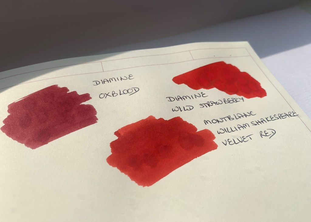As I was swatching it occurred to me that Scribo’s “Notturno Viola” is going to match the Lamy Safari Violet Blackberry pen, but I’m not sure that purple where I want to be right at the moment. I’m equally unsure about the reds. Diamine’s “Wild Strawberry” always draws me in, and I’ve got a significant amount of it still sitting in my Namisu Orion. Swatching them together, I realised that “Wild Strawberry” and “Velvet Red” share some chromosomes, with Strawberry being the outgoing, slightly brash one, and Velvet being its rather more introspective cousin.